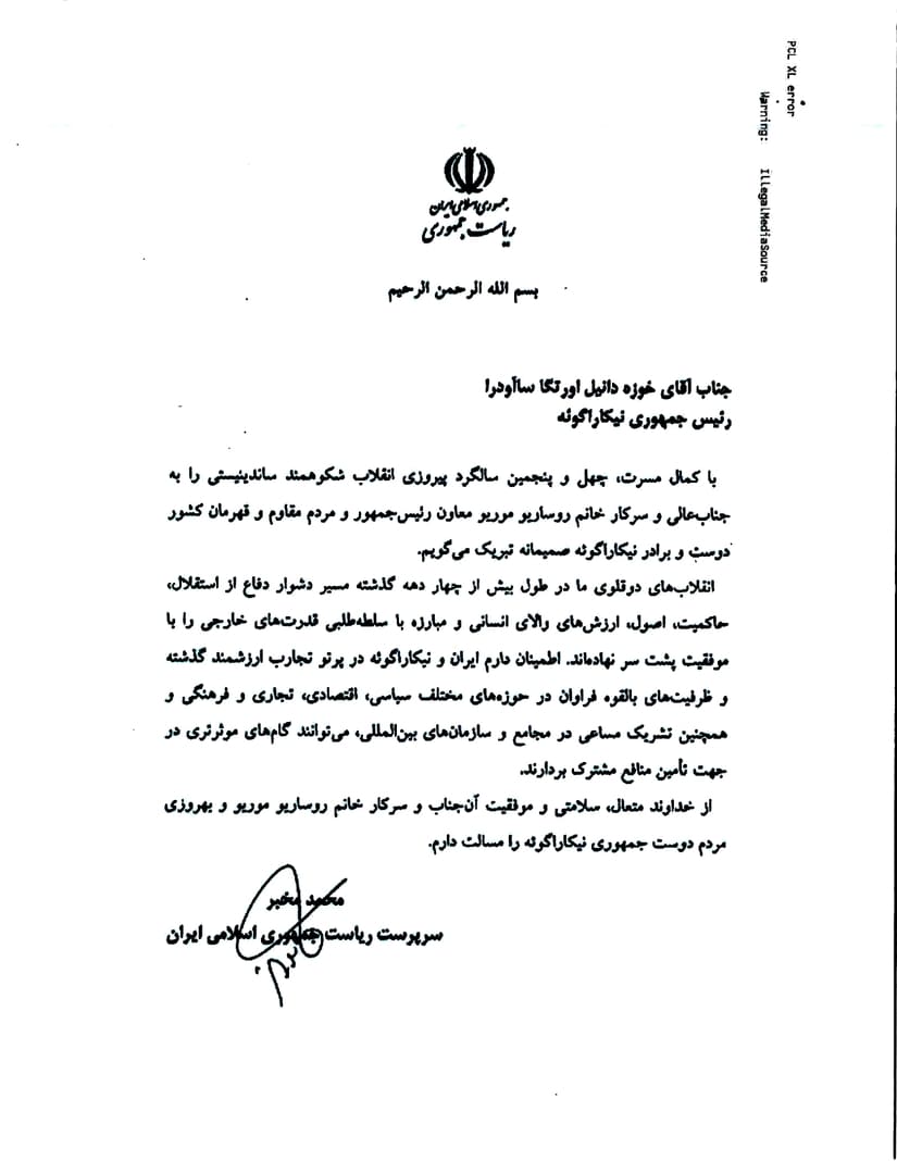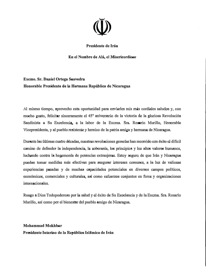 Mensaje de Felicitaciones del Compañero Mohammad Mokhbar, Presidente Interino de la República Islámica de Irán, a nuestro Pueblo y Gobierno, al conmemorarse 45 Años de la Revolución Popular Sandinista.