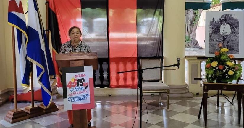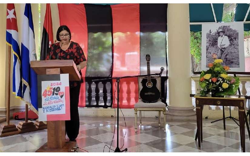 Por su parte, nuestra Embajadora, Compañera Guisell Morales Echaverry, con gratitud transmitió el saludo de nuestro Pueblo, de nuestro Presidente-Comandante Daniel Ortega y de nuestra Vicepresidenta, Compañera Rosario Murillo. Rememoró el Heroísmo de nuestro Pueblo Glorioso, de sus Héroes y Mártires, que jamás se rindieron. Destacó los logros de nuestra Revolución y su Modelo transformador, continuando el Legado de Dignidad y Valentía del General de Hombres y Mujeres Libres, Augusto C. Sandino, de generaciones de patriotas y que bajo el liderazgo del FSLN, símbolo de resistencia y lucha, avanza indetenible en caminos victoriosos de Paz y Prosperidad. Agradeció la voz comprometida y solidaria de la Revolución Cubana, su Pueblo y Gobierno, contra las agresiones del imperio y sus aliados y en defensa del derecho de los nicaragüenses a su autodeterminación y felicidad.