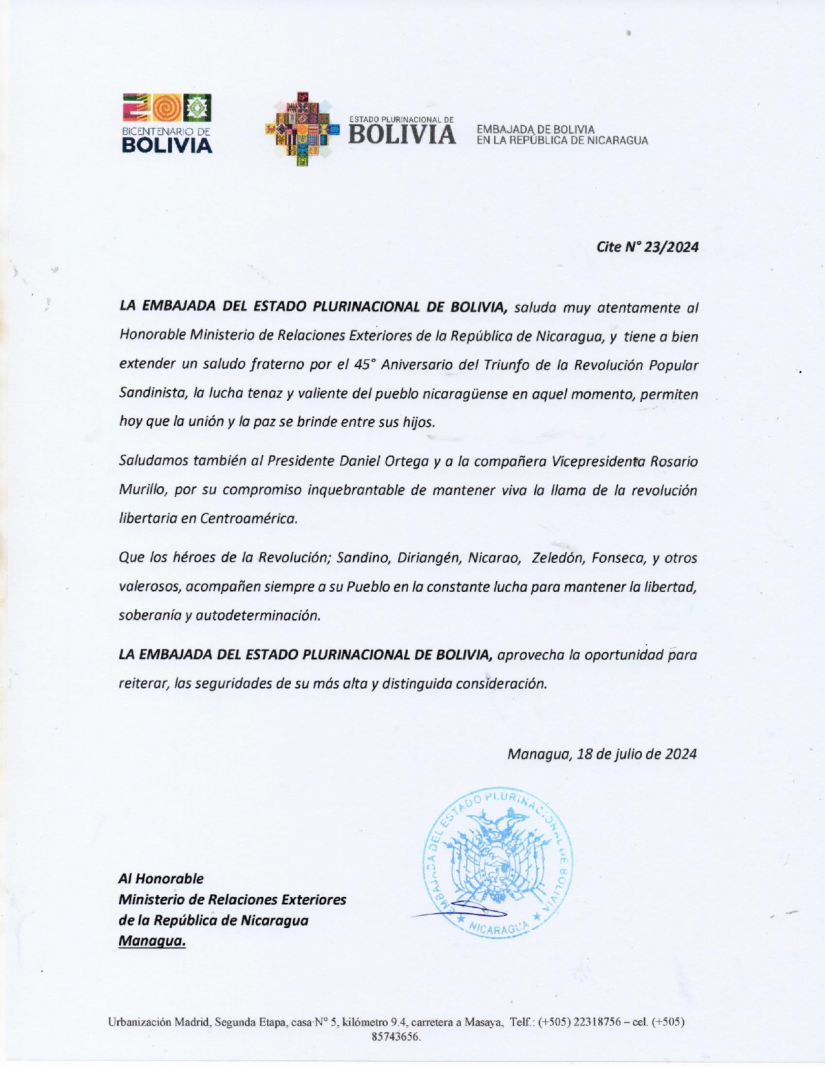 Mensaje de Felicitaciones de Embajada del Estado Plurinacional de Bolivia en nuestro País, a nuestro Pueblo y Gobierno, al conmemorarse 45 Años de la Revolución Popular Sandinista.