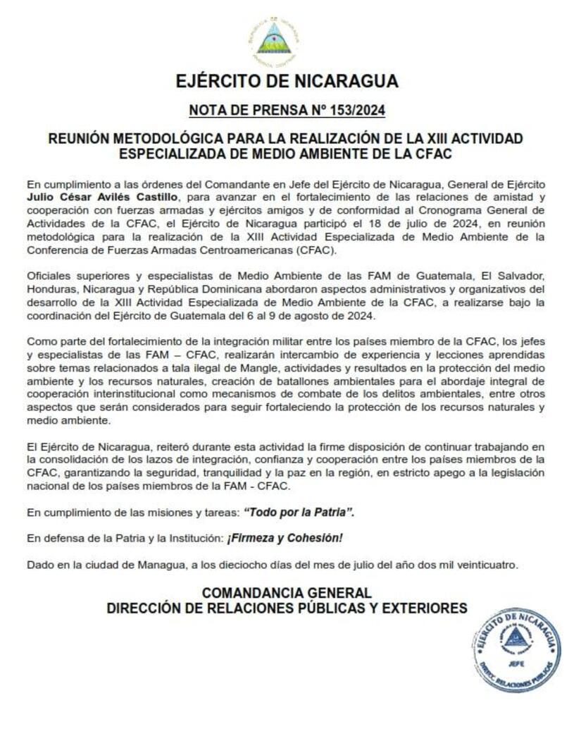 En cumplimiento a las órdenes del Comandante en Jefe del Ejército de Nicaragua, General de Ejército Julio César Avilés Castillo, para avanzar en el fortalecimiento de las relaciones de amistad y cooperación con fuerzas armadas y ejércitos amigos y de conformidad al Cronograma General de Actividades de la CFAC, el Ejército de Nicaragua participó el 18 de julio de 2024, en reunión metodológica para la realización de la XIII Actividad Especializada de Medio Ambiente de la Conferencia de Fuerzas Armadas Centroamericanas (CFAC).