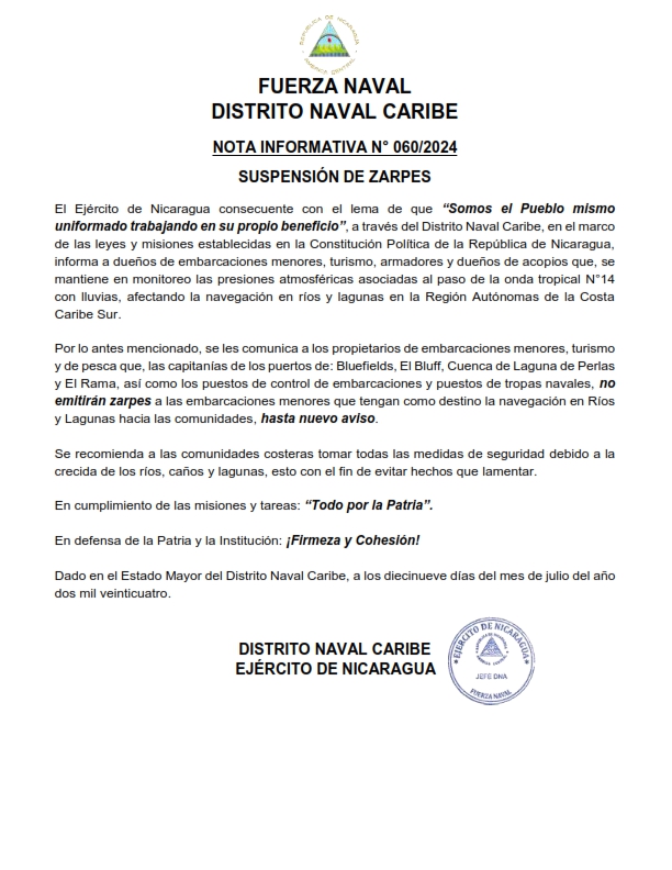 El Ejército de Nicaragua consecuente con el lema de que “Somos el Pueblo mismo uniformado trabajando en su propio beneficio”, a través del Distrito Naval Caribe, en el marco de las leyes y misiones establecidas en la Constitución Política de la República de Nicaragua, informa a dueños de embarcaciones menores, turismo, armadores y dueños de acopios que, se mantiene en monitoreo las presiones atmosféricas asociadas al paso de la onda tropical N°14 con lluvias, afectando la navegación en ríos y lagunas en la Región Autónomas de la Costa Caribe Sur.