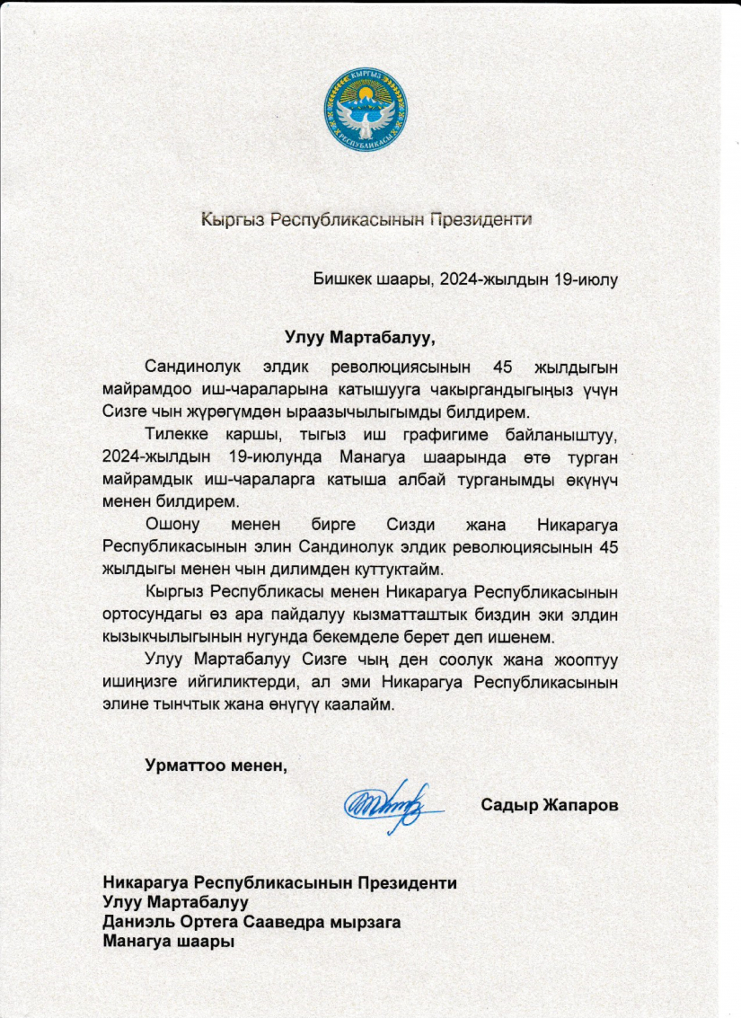 Estoy convencido de que la cooperación mutuamente beneficiosa entre la República Kirguisa y la República de Nicaragua seguirá fortaleciéndose para el bien de nuestros dos pueblos.