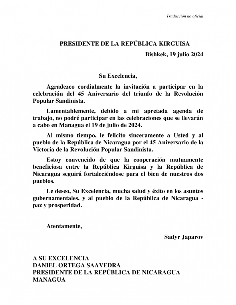 Lamentablemente, debido a mi apretada agenda de trabajo, no podré participar en las celebraciones que se llevarán a cabo en Managua el 19 de julio de 2024.