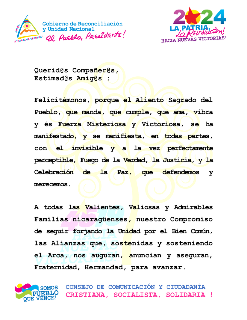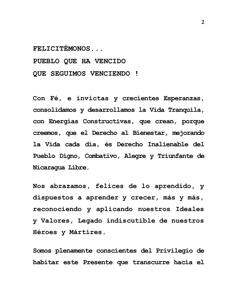Con Fé, e invictas y crecientes Esperanzas, consolidamos y desarrollamos la Vida Tranquila, con Energías Constructivas, que crean, porque creemos, que el Derecho al Bienestar, mejorando la Vida cada día, és Derecho Inalienable del Pueblo Digno, Combativo, Alegre y Triunfante de Nicaragua Libre.