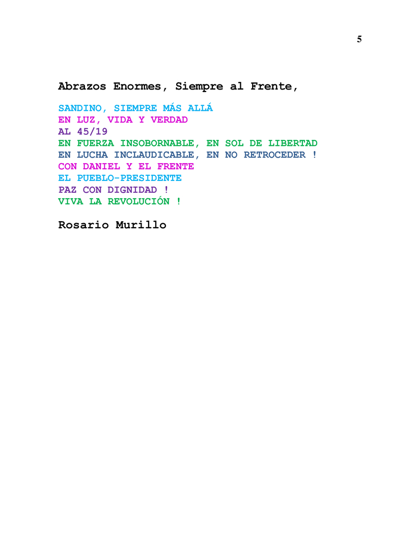 A las poses, a la envidia que les corroe, a la frustración y las rabias de los que nunca pudieron, oponemos el Vigor y la Gloria de la Revolución Popular Sandinista, como Verdad Primera y Última. La Revolución és Integridad sellada con la Voluntad de Dios, y la Santa Sangre de miles y miles de nicaragüenses.