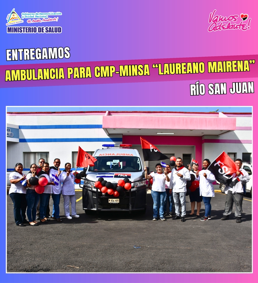 Hoy Lunes 22 de Julio de 2024, se realizará entrega de una Ambulancia a la CMP-MINSA “Laureano Mairena”, Río San Juan, para mejorar las condiciones de traslado en situaciones de emergencia a 6,450 asegurad@s, jubilad@s y sus familiares que habitan en este Municipio. Inversión 1.7 millones de córdobas.