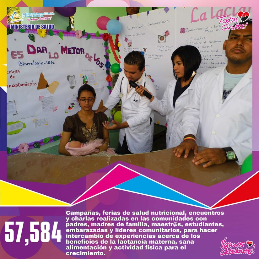 • 57,584 Campañas, ferias de salud nutricional, encuentros y charlas realizadas en las comunidades con padres, madres de familia, maestr@s, estudiantes, embarazadas y líderes comunitarios, para hacer intercambio de experiencia acerca de los beneficios de la lactancia materna, sana alimentación y actividad física para el crecimiento.