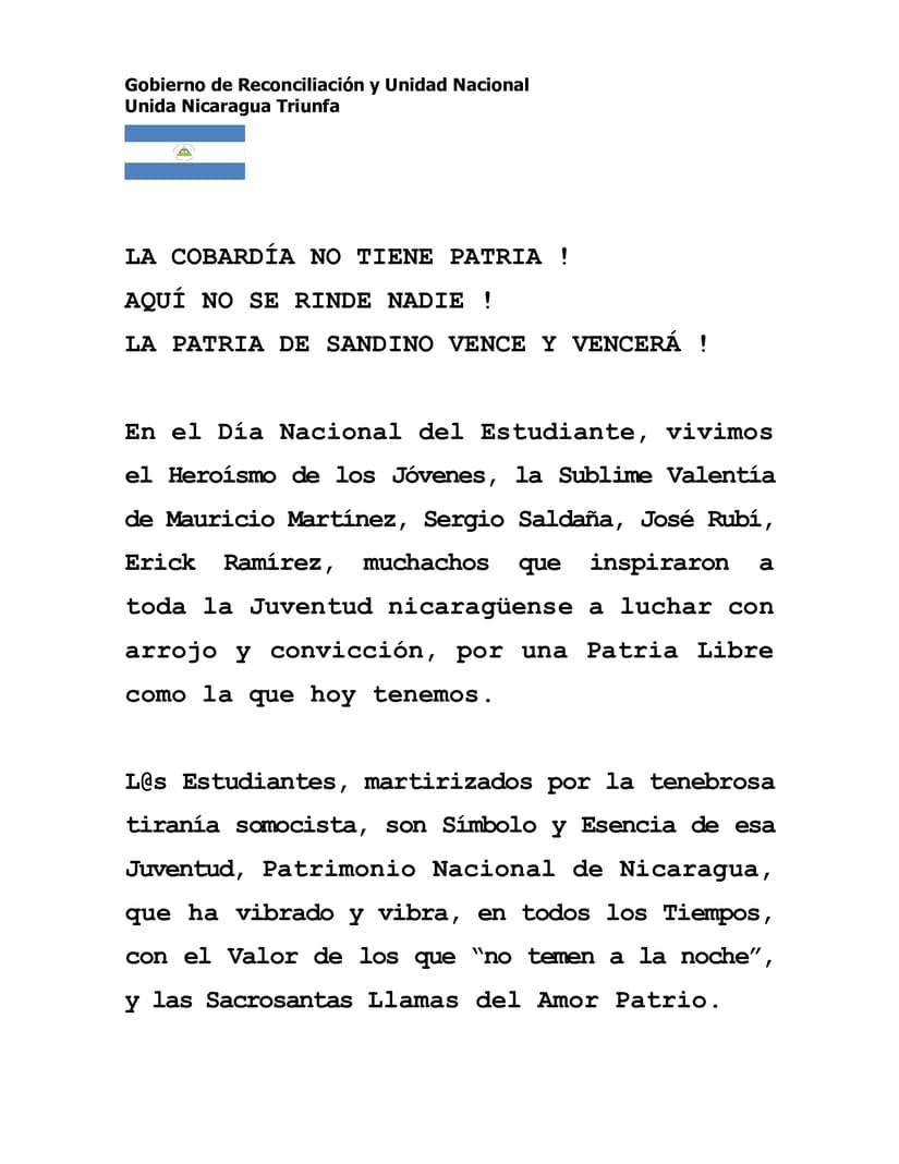 En el Día Nacional del Estudiante, vivimos el Heroísmo de los Jóvenes, la Sublime Valentía de Mauricio Martínez, Sergio Saldaña, José Rubí, Erick Ramírez, muchachos que inspiraron a toda la Juventud nicaragüense a luchar con arrojo y convicción, por una Patria Libre como la que hoy tenemos.