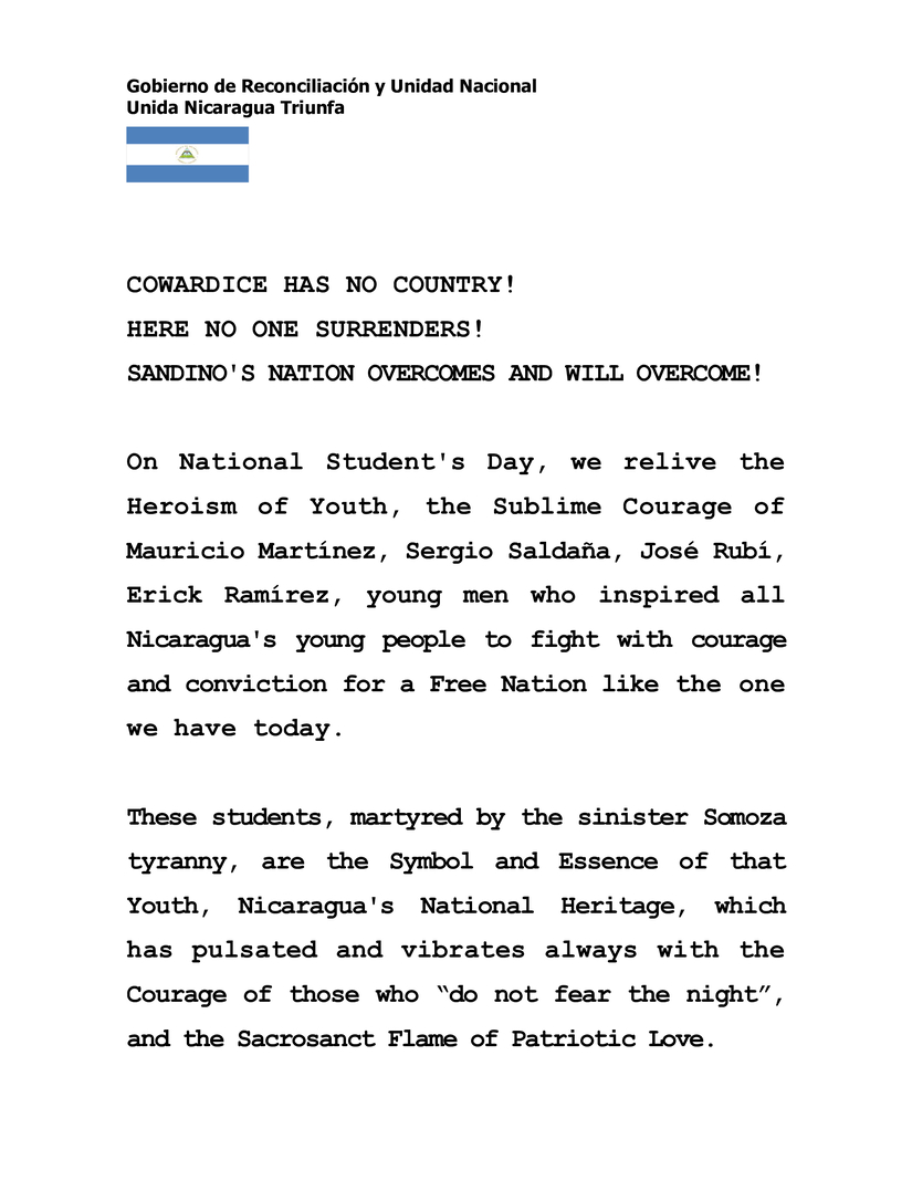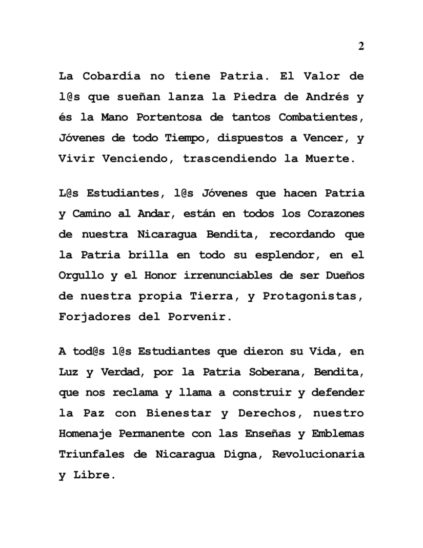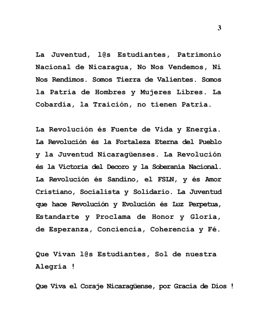 La Juventud, l@s Estudiantes, Patrimonio Nacional de Nicaragua, No Nos Vendemos, Ni Nos Rendimos. Somos Tierra de Valientes. Somos la Patria de Hombres y Mujeres Libres. La Cobardía, la Traición, no tienen Patria.