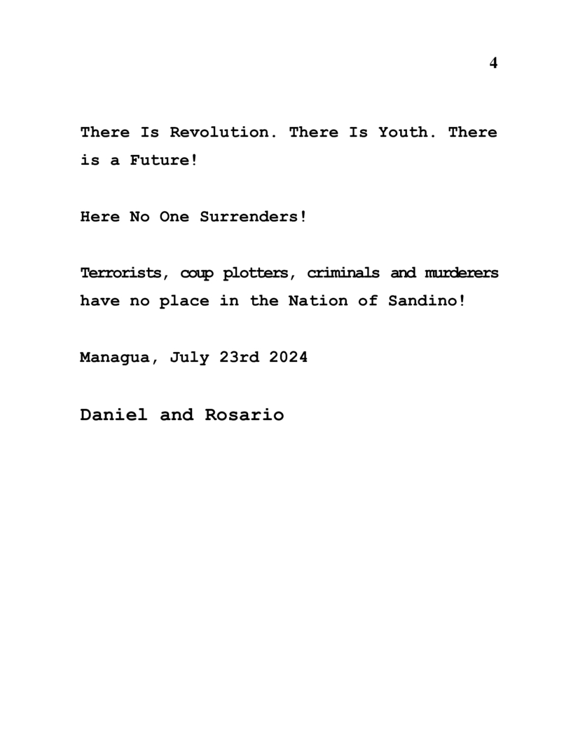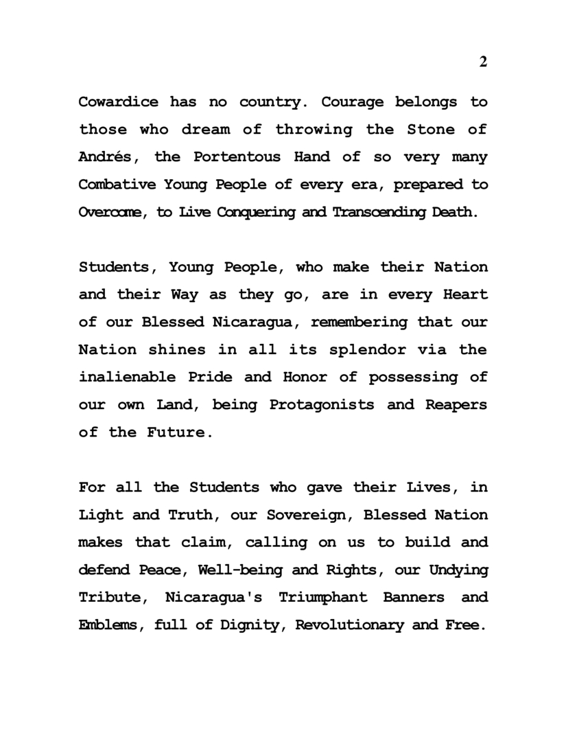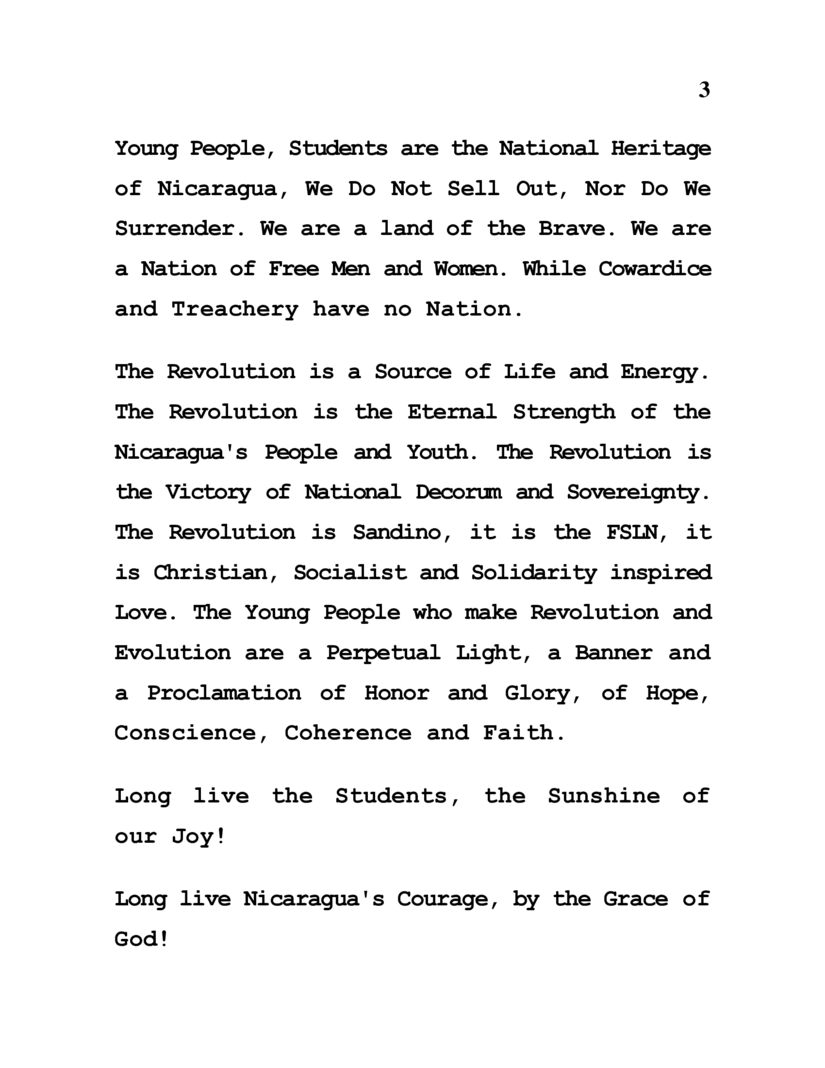 La Revolución és Fuente de Vida y Energía. La Revolución és la Fortaleza Eterna del Pueblo y la Juventud Nicaragüenses. La Revolución és la Victoria del Decoro y la Soberanía Nacional. La Revolución és Sandino, el FSLN, y és Amor Cristiano, Socialista y Solidario. La Juventud que hace Revolución y Evolución és Luz Perpetua, Estandarte y Proclama de Honor y Gloria, de Esperanza, Conciencia, Coherencia y Fé.