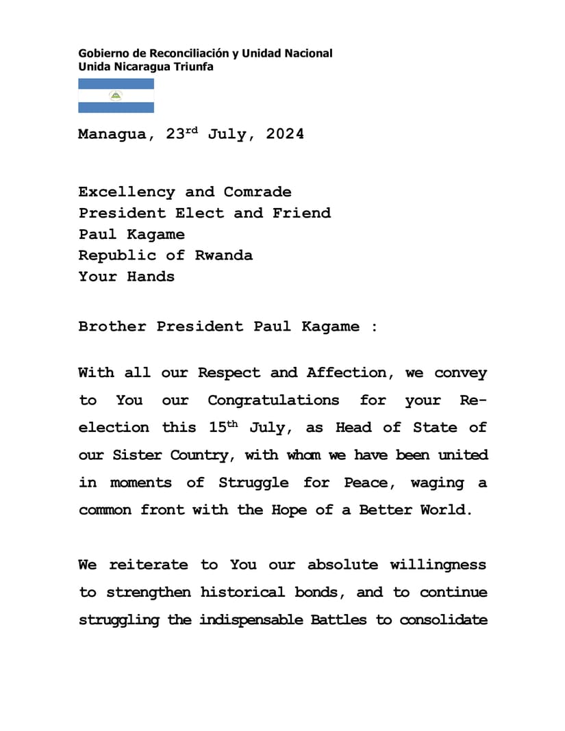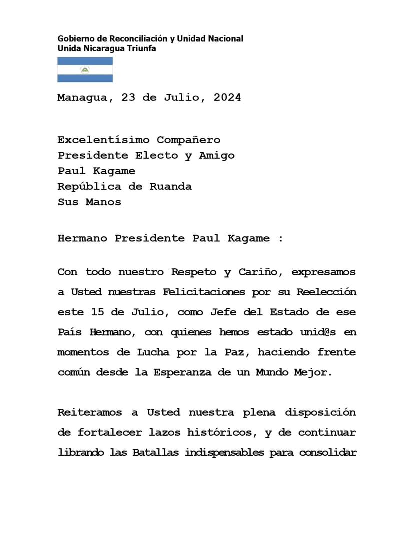 Mensaje de Saludos y Congratulaciones del Presidente Comandante Daniel Ortega y la Vicepresidenta Compañera Rosario Murillo, al Compañero Paul Kagame, Presidente de Ruanda, por su Reelección para un Nuevo Período de Gobierno.