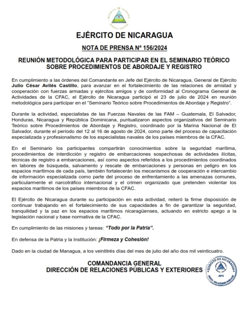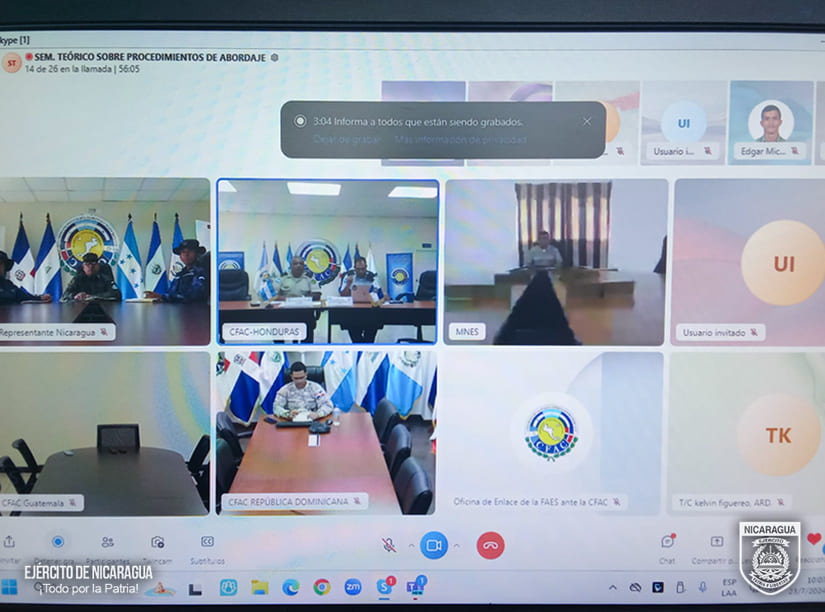 En cumplimiento a las órdenes del Comandante en Jefe del Ejército de Nicaragua, General de Ejército Julio César Avilés Castillo, para avanzar en el fortalecimiento de las relaciones de amistad y cooperación con fuerzas armadas y ejércitos amigos y de conformidad al Cronograma General de Actividades de la CFAC, el Ejército de Nicaragua participó el 23 de julio de 2024 en reunión metodológica para participar en el “Seminario Teórico sobre Procedimientos de Abordaje y Registro”.