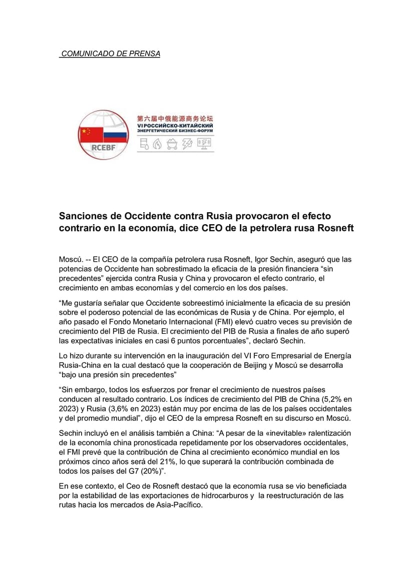 “Sin embargo, todos los esfuerzos por frenar el crecimiento de nuestros países conducen al resultado contrario. Los índices de crecimiento del PIB de China (5,2% en 2023) y Rusia (3,6% en 2023) están muy por encima de las de los países occidentales y del promedio mundial”, dijo el CEO de la empresa Rosneft en su discurso en Moscú.
