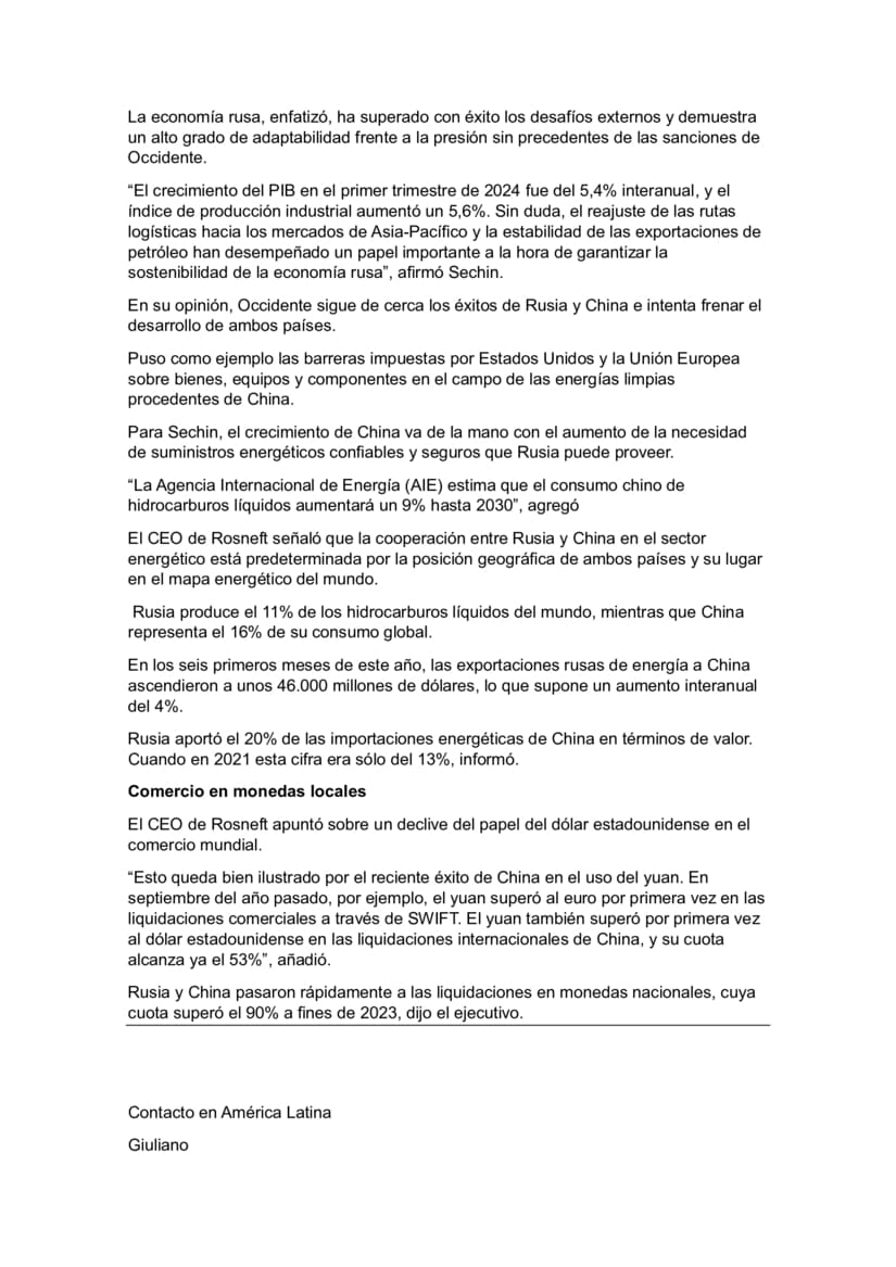 “El crecimiento del PIB en el primer trimestre de 2024 fue del 5,4% interanual, y el índice de producción industrial aumentó un 5,6%. Sin duda, el reajuste de las rutas logísticas hacia los mercados de Asia-Pacífico y la estabilidad de las exportaciones de petróleo han desempeñado un papel importante a la hora de garantizar la sostenibilidad de la economía rusa”, afirmó Sechin.