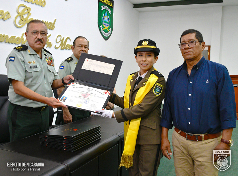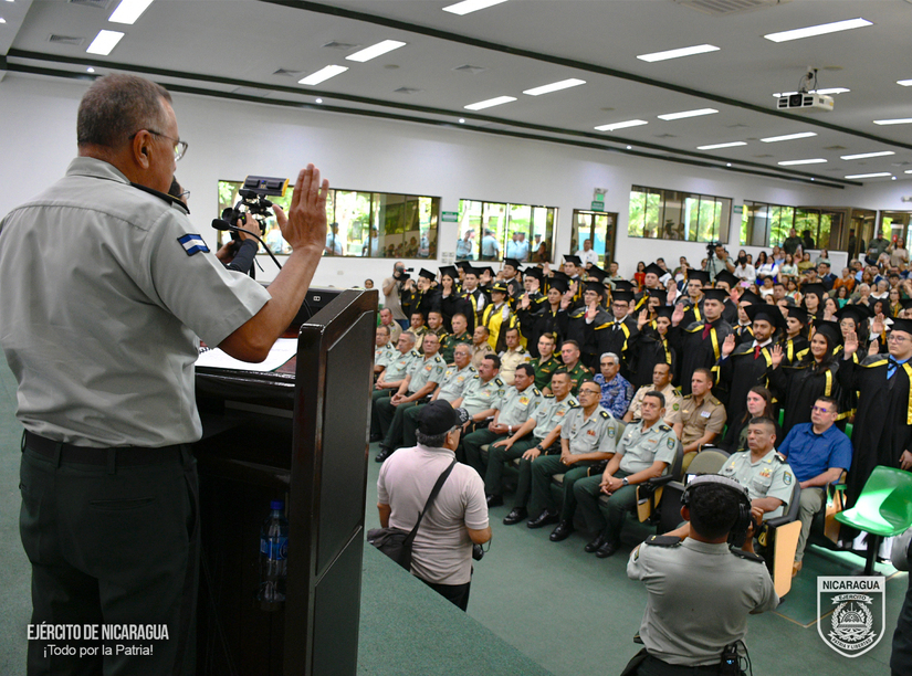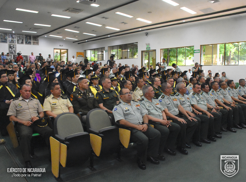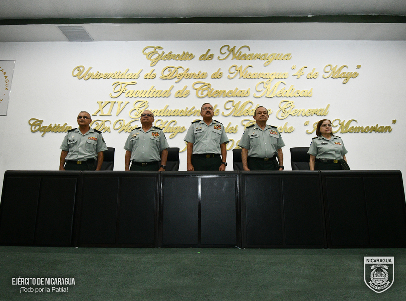 En representación del Comandante en Jefe del Ejército de Nicaragua, General de Ejército Julio César Avilés Castillo, presidió la ceremonia el Inspector General, Mayor General Marvin Elías Corrales Rodríguez, acompañado por el rector de la Universidad de Defensa de Nicaragua, General de Brigada Manuel Geovanni Guevara Rocha, el jefe del Cuerpo Médico Militar, Coronel y Doctor Marco Antonio Salas Cruz, la decana de la Facultad de Ciencias Médicas “Coronel y Doctor Juan Ignacio Gutiérrez Sacasa”, Teniente Coronel y Doctora Angélica Alvarado Vanegas y el director de la Escuela de Medicina “Teniente Coronel y Doctor Sergio Martínez Ordóñez”, Teniente Coronel y Doctor Luis Alberto Blandón Herrera.