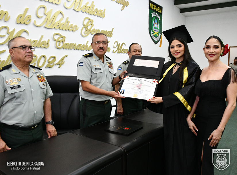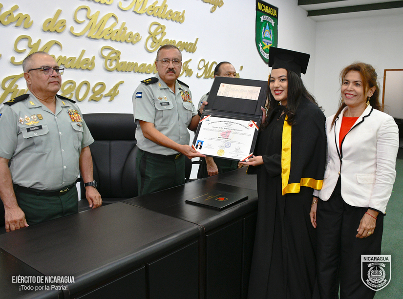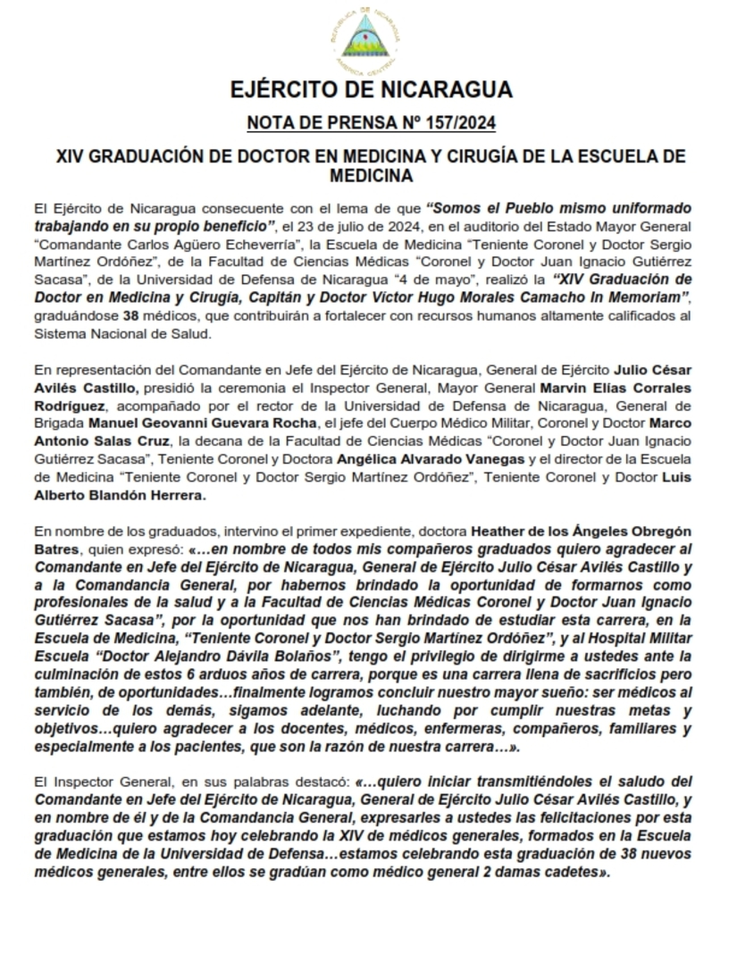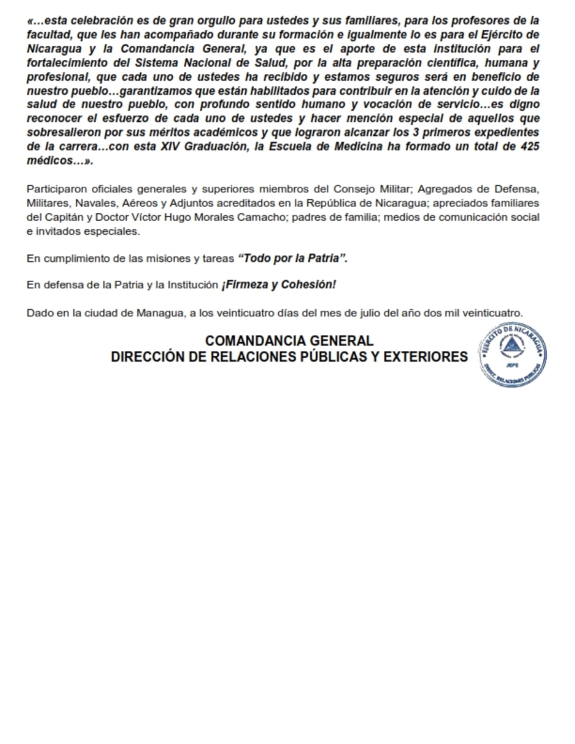 El Ejército de Nicaragua consecuente con el lema de que “Somos el Pueblo mismo uniformado trabajando en su propio beneficio”, el 23 de julio de 2024, en el auditorio del Estado Mayor General “Comandante Carlos Agüero Echeverría”, la Escuela de Medicina “Teniente Coronel y Doctor Sergio Martínez Ordóñez”, de la Facultad de Ciencias Médicas “Coronel y Doctor Juan Ignacio Gutiérrez Sacasa”, de la Universidad de Defensa de Nicaragua “4 de mayo”, realizó la “XIV Graduación de Doctor en Medicina y Cirugía, Capitán y Doctor Víctor Hugo Morales Camacho In Memoriam”, graduándose 38 médicos, que contribuirán a fortalecer con recursos humanos altamente calificados al Sistema Nacional de Salud.