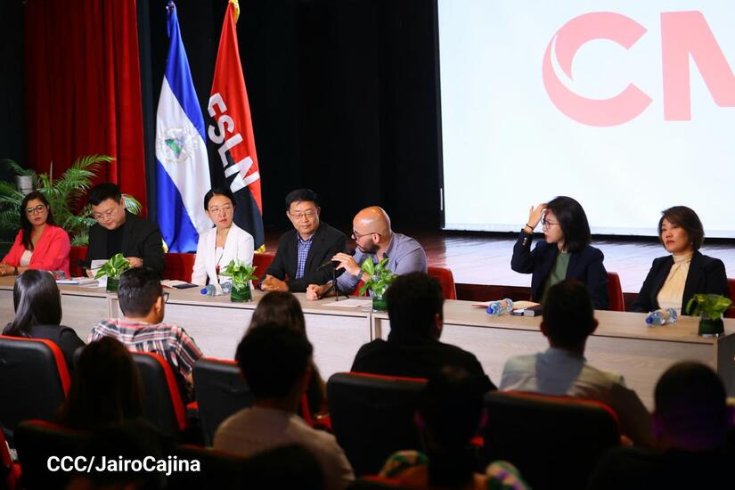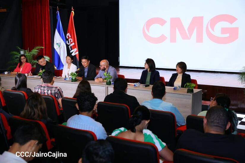 La tarde de este jueves 25 de julio, se dio un fructífero encuentro de Intercambio de Comunicadores del Grupo de Medios de China/América Latina con estudiantes de Comunicación de la UNAN-Managua y de la Universidad Nacional Casimiro Sotelo.