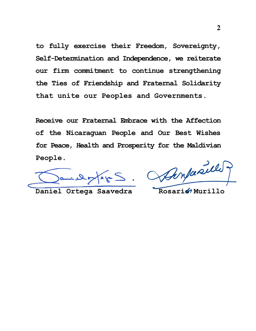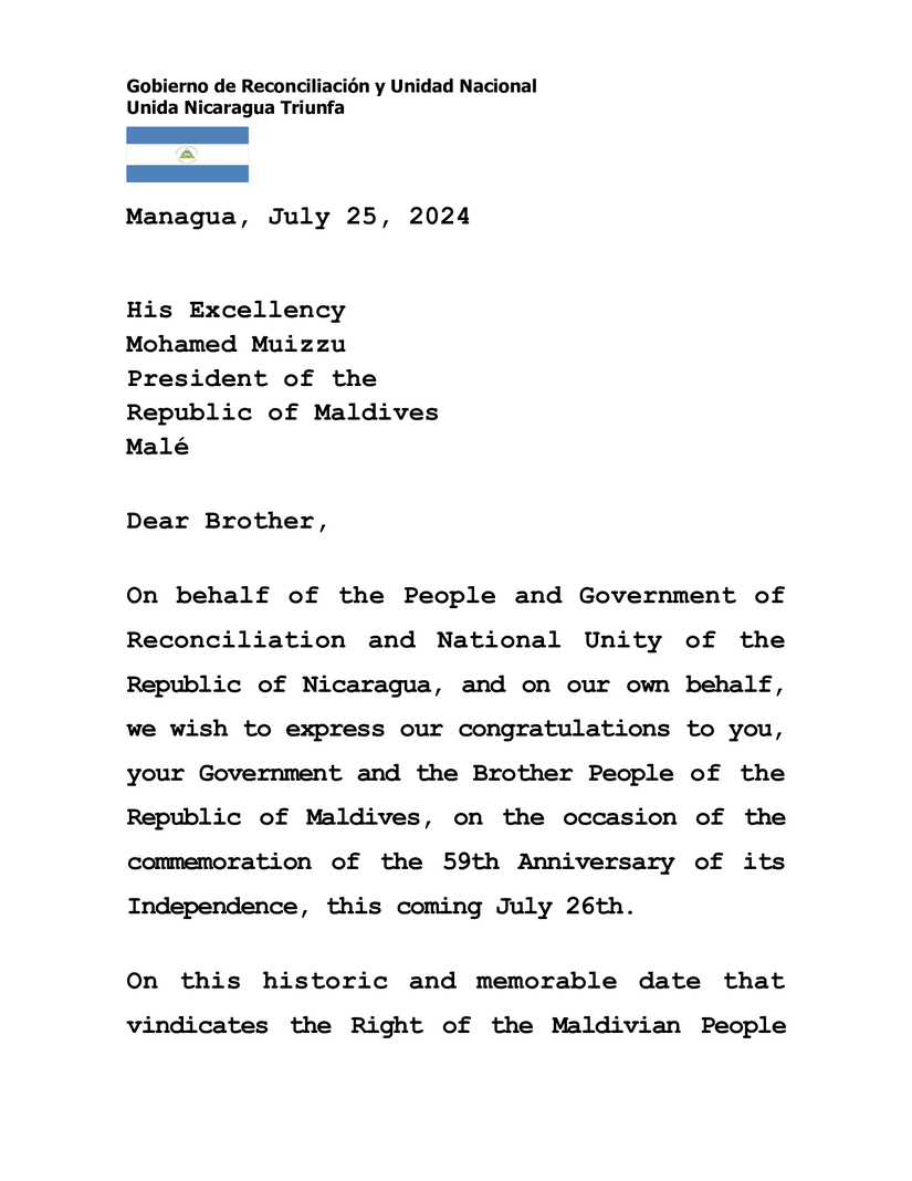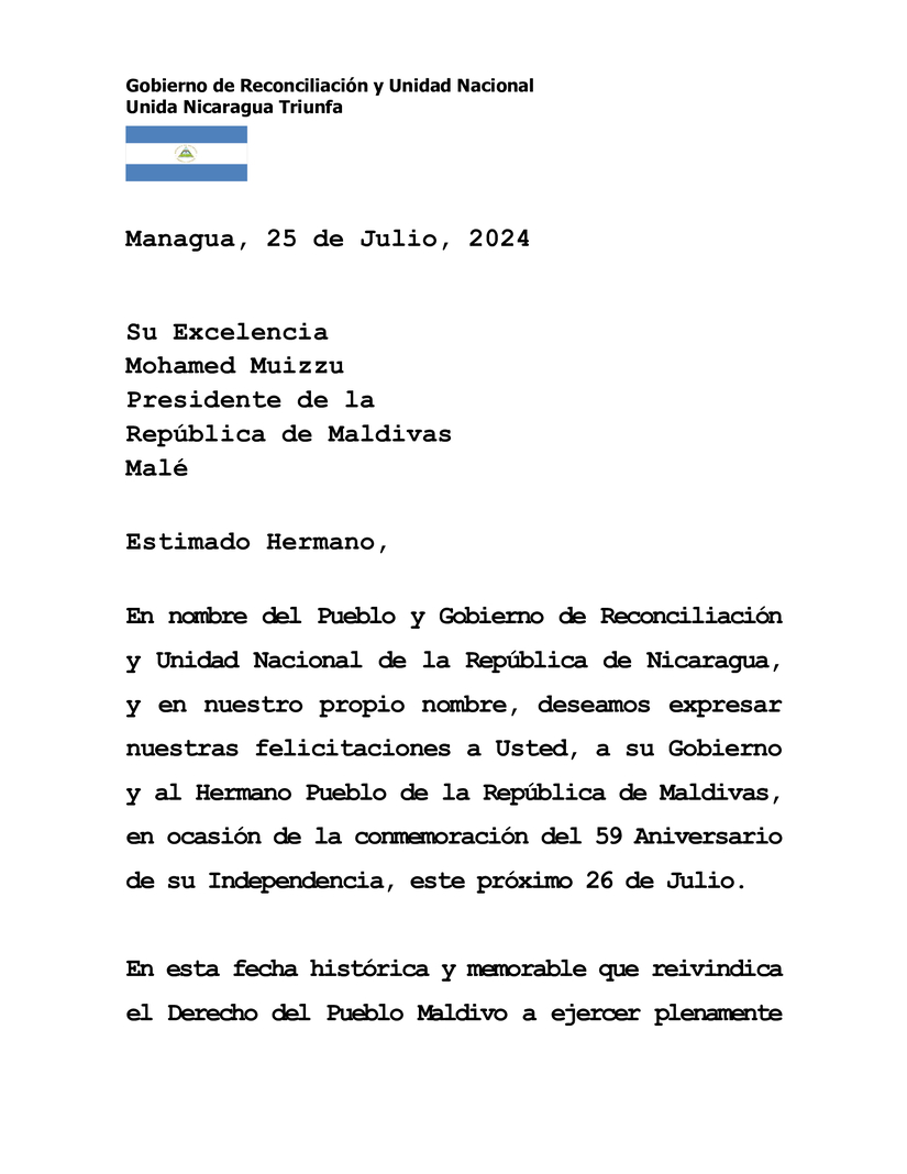 En nombre del Pueblo y Gobierno de Reconciliación y Unidad Nacional de la República de Nicaragua, y en nuestro propio nombre, deseamos expresar nuestras felicitaciones a Usted, a su Gobierno y al Hermano Pueblo de la República de Maldivas, en ocasión de la conmemoración del 59 Aniversario de su Independencia, este próximo 26 de Julio.