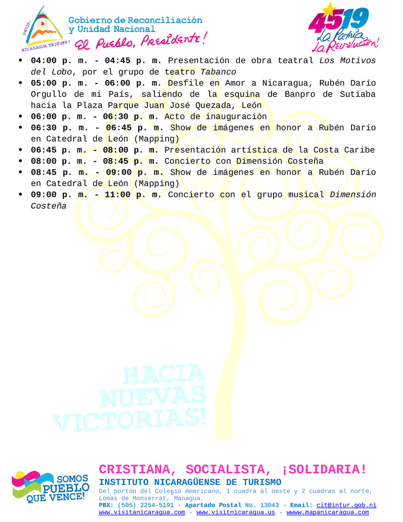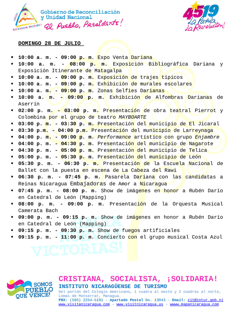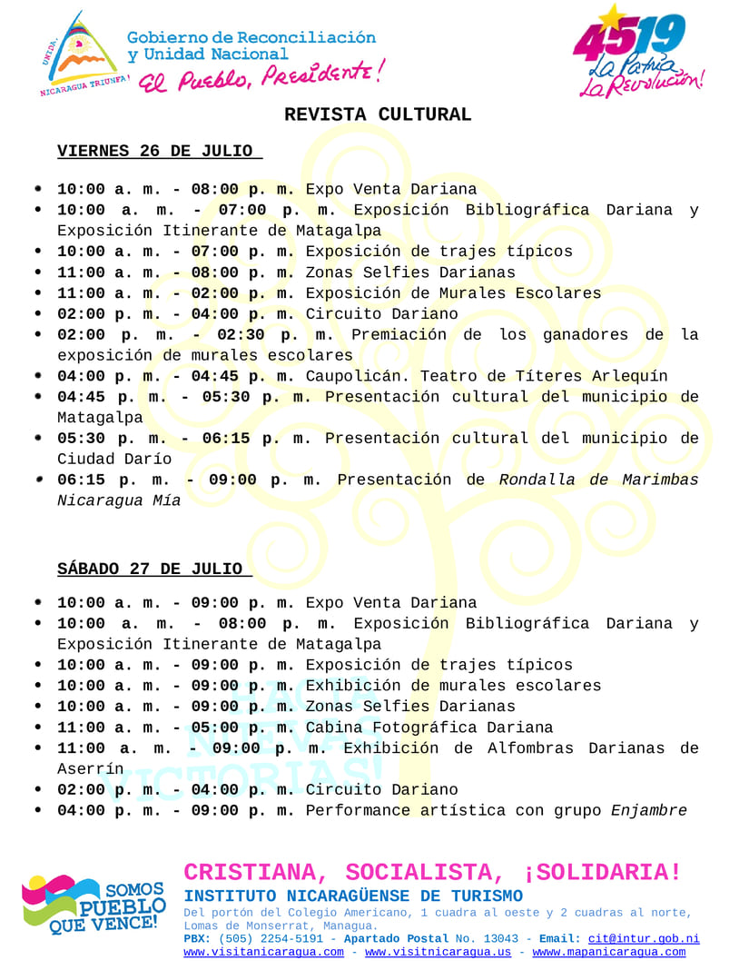 Durante 3 días consecutivos, del 26 al 28 de julio, este festival contará una serie de actividades culturales y tradicionales, para el disfrute de las familias nicaragüenses y de otras nacionalidades, que conmemoran la admiración y el respeto por uno de los libros más insigne de nuestro aclamado poeta. Dentro de las actividades más relevantes tendremos exposición de pinturas darianas, exposición de trajes folclóricos, presentación de ballet, presentaciones culturales y artísticas de cada uno de los municipios, obras teatrales, concurso de murales, expo venta de gastronomía, alfombras de aserrín, pasarela Dariana, proyección en la fachada frontal de la Catedral (Mappping) y fuegos artificiales.