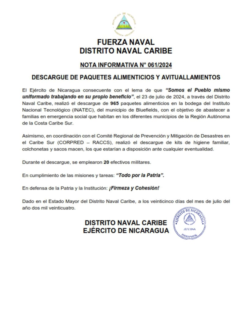 El Ejército de Nicaragua consecuente con el lema de que “Somos el Pueblo mismo uniformado trabajando en su propio beneficio”, el 23 de julio de 2024, a través del Distrito Naval Caribe, realizó el descargue de 965 paquetes alimenticios en la bodega del Instituto Nacional Tecnológico (INATEC), del municipio de Bluefields, con el objetivo de abastecer a familias en emergencia social que habitan en los diferentes municipios de la Región Autónoma de la Costa Caribe Sur.