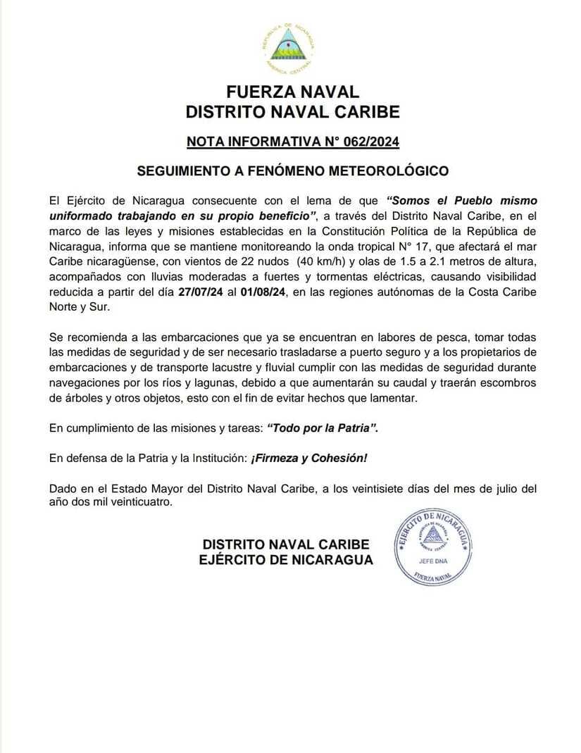 El Ejército de Nicaragua consecuente con el lema de que “Somos el Pueblo mismo uniformado trabajando en su propio beneficio”, a través del Distrito Naval Caribe, en el marco de las leyes y misiones establecidas en la Constitución Política de la República de Nicaragua, informa que se mantiene monitoreando la onda tropical N° 17, que afectará el mar Caribe nicaragüense, con vientos de 22 nudos (40 km/h) y olas de 1.5 a 2.1 metros de altura, acompañados con lluvias moderadas a fuertes y tormentas eléctricas, causando visibilidad reducida a partir del día 27/07/24 al 01/08/24, en las regiones autónomas de la Costa Caribe Norte y Sur.