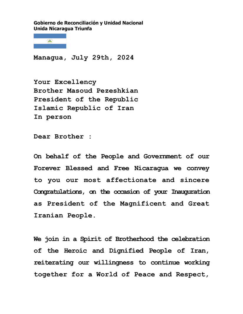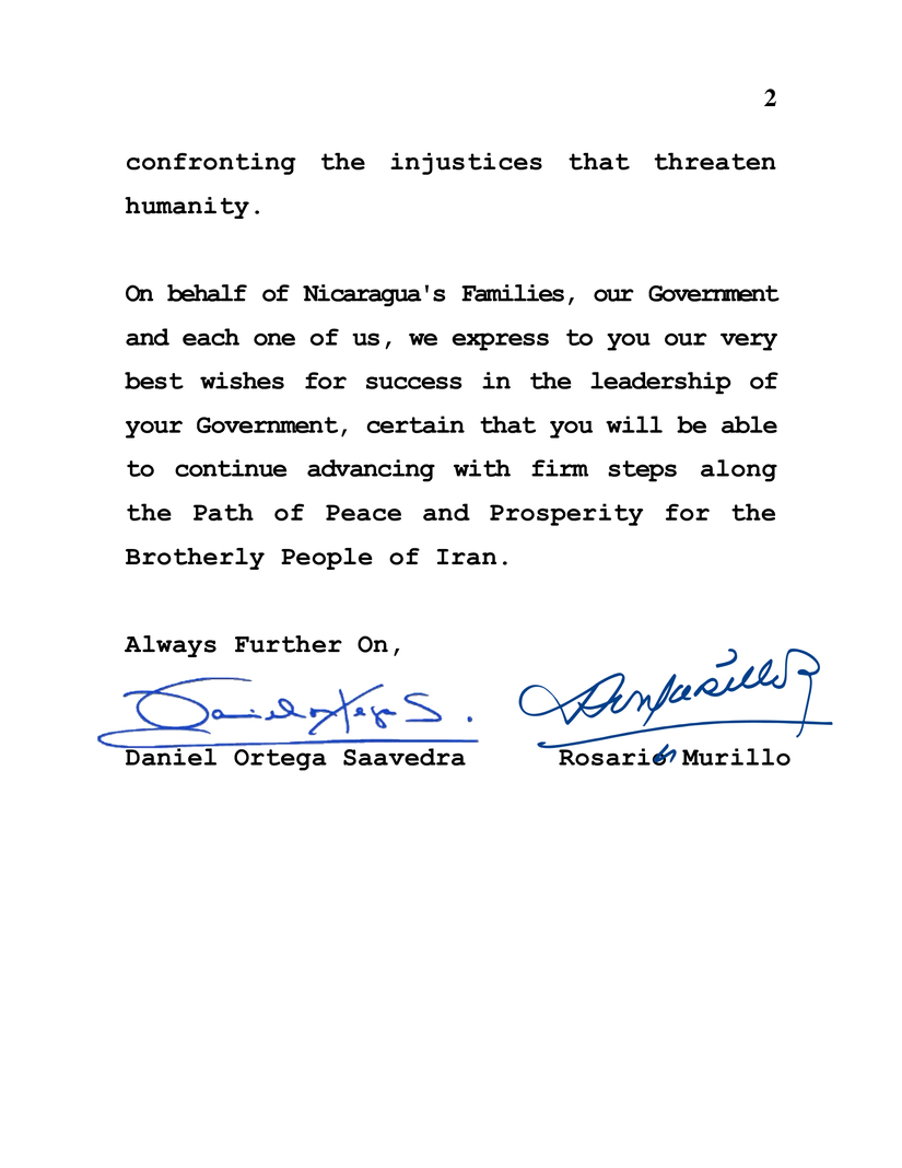 En nombre de las Familias nicaragüenses, de nuestro Gobierno y de cada un@ de nosotr@s, le expresamos nuestros mejores deseos de éxito en la conducción de su Gobierno, con la certeza de que sabrá continuar avanzando con pasos firmes en el Camino de Paz y Prosperidad del Hermano Pueblo de Irán.