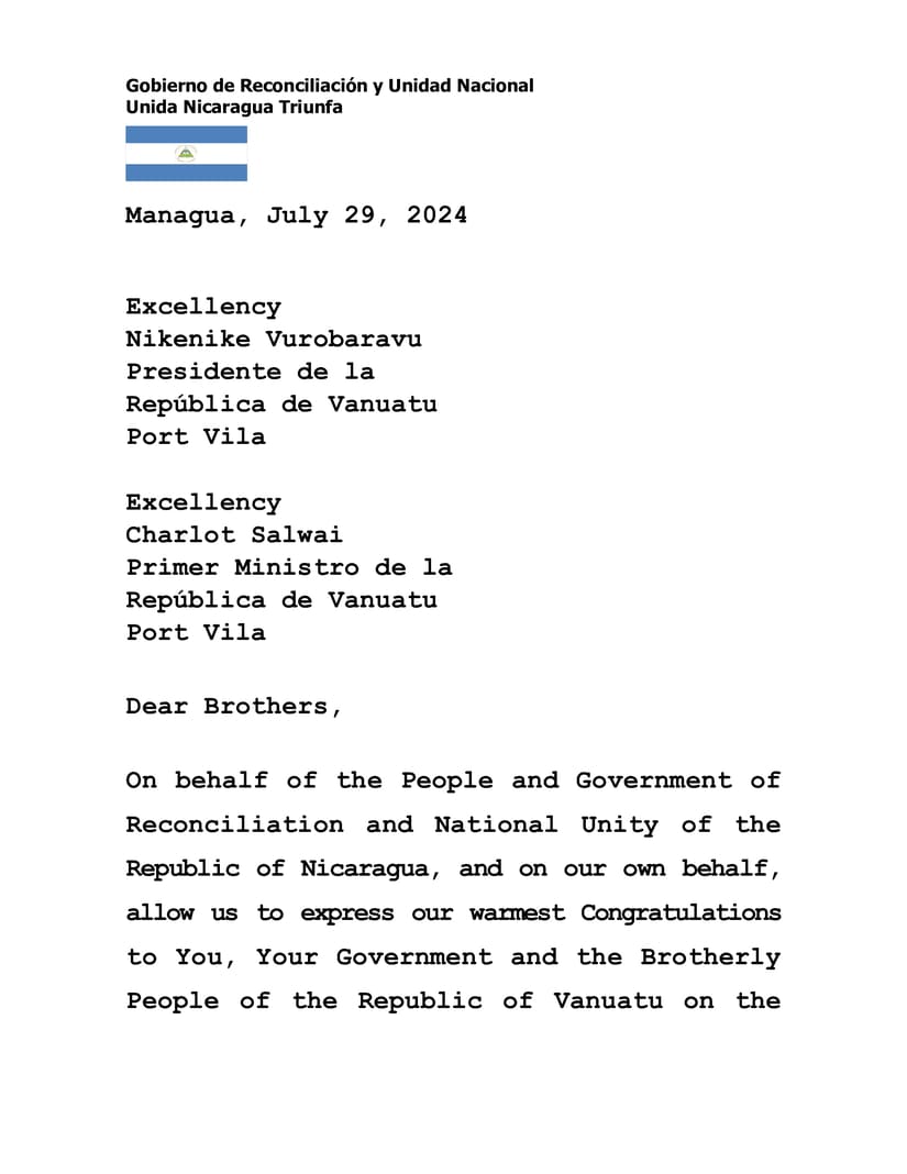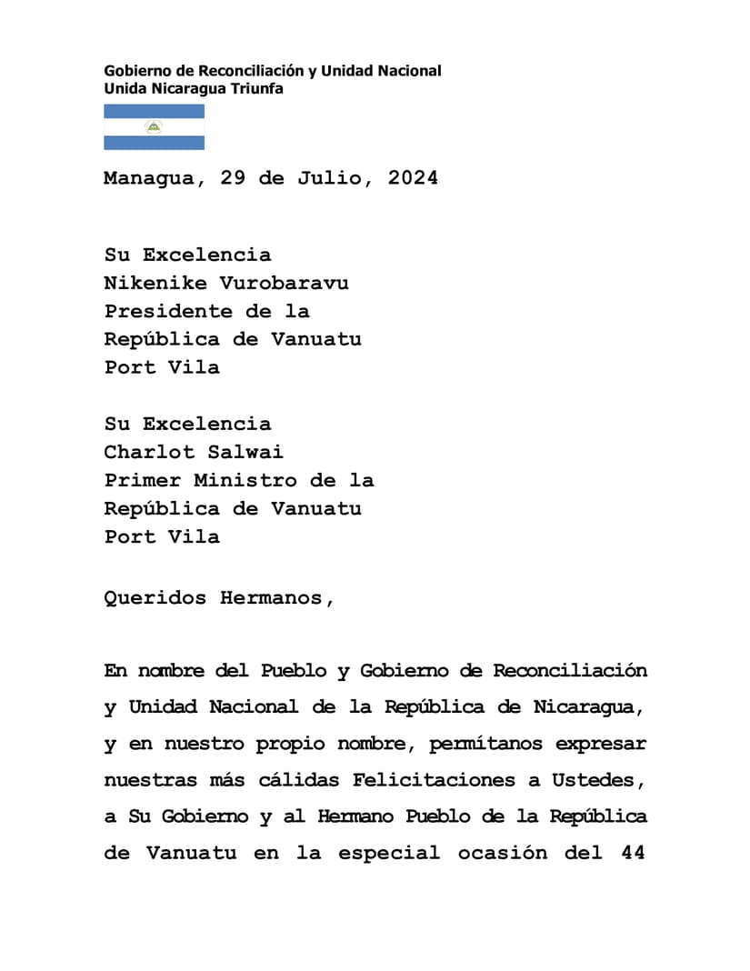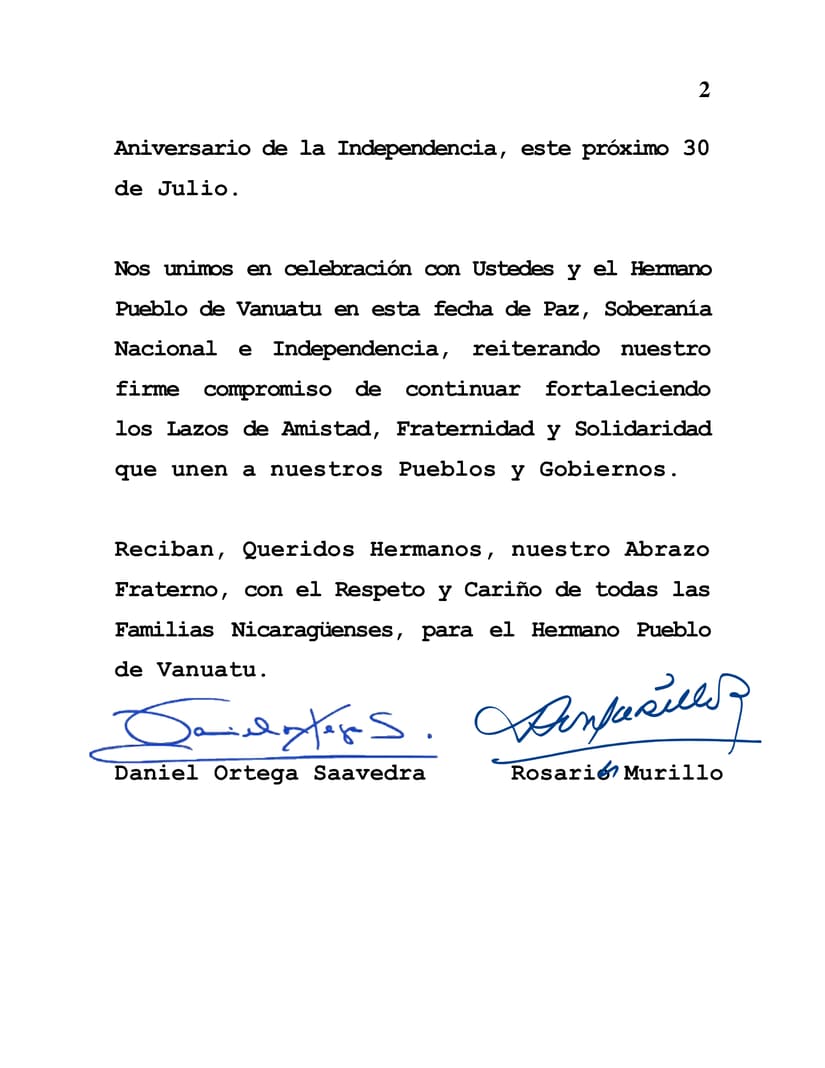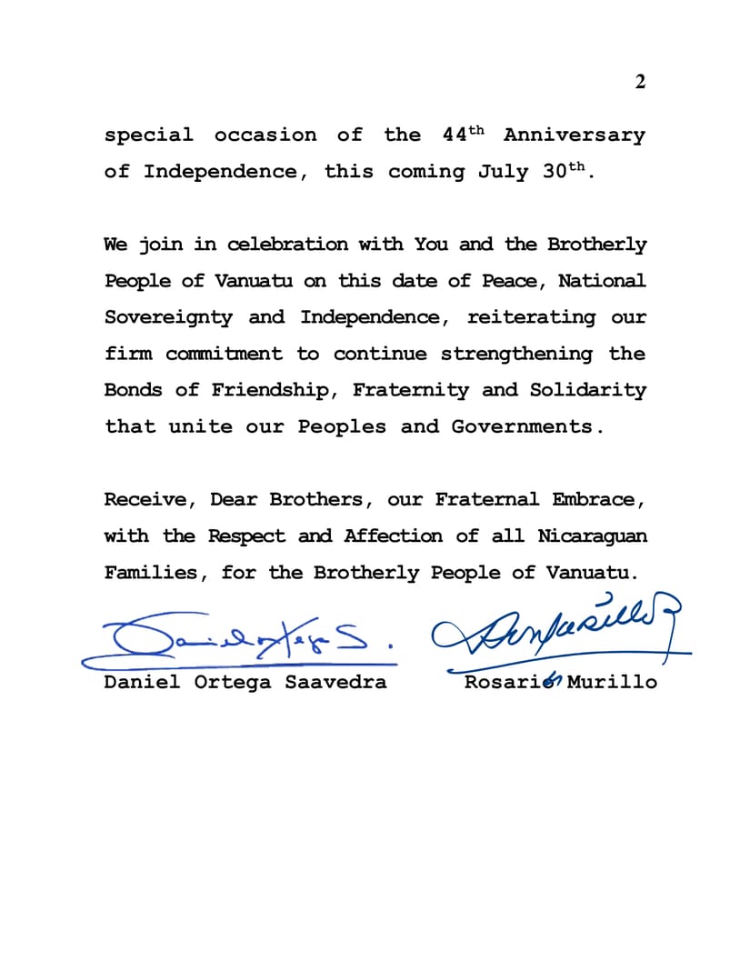 En nombre del Pueblo y Gobierno de Reconciliación y Unidad Nacional de la República de Nicaragua, y en nuestro propio nombre, permítanos expresar nuestras más cálidas Felicitaciones a Ustedes, a Su Gobierno y al Hermano Pueblo de la República de Vanuatu en la especial ocasión del 44 Aniversario de la Independencia, este próximo 30 de Julio.
