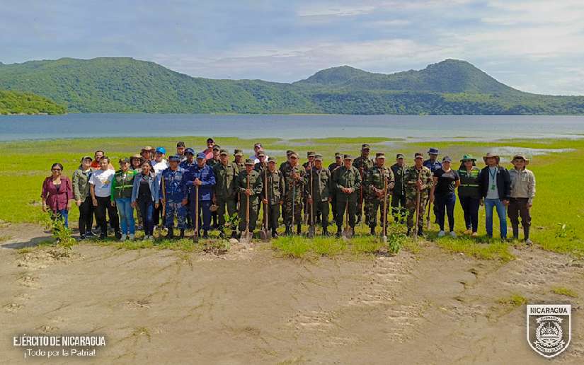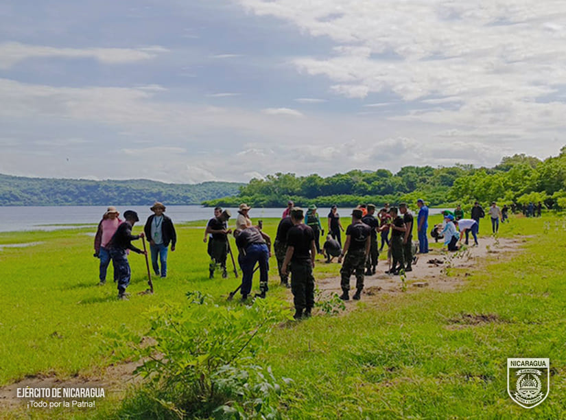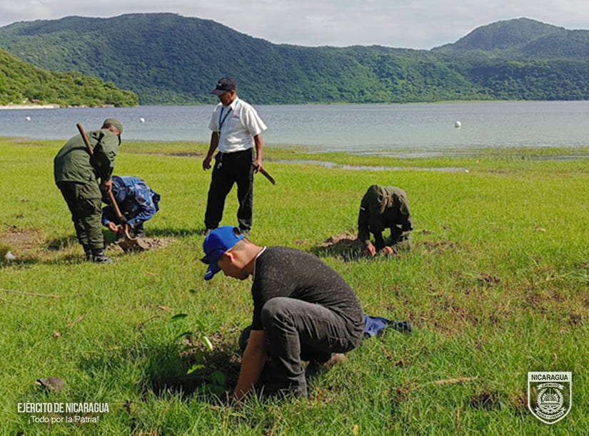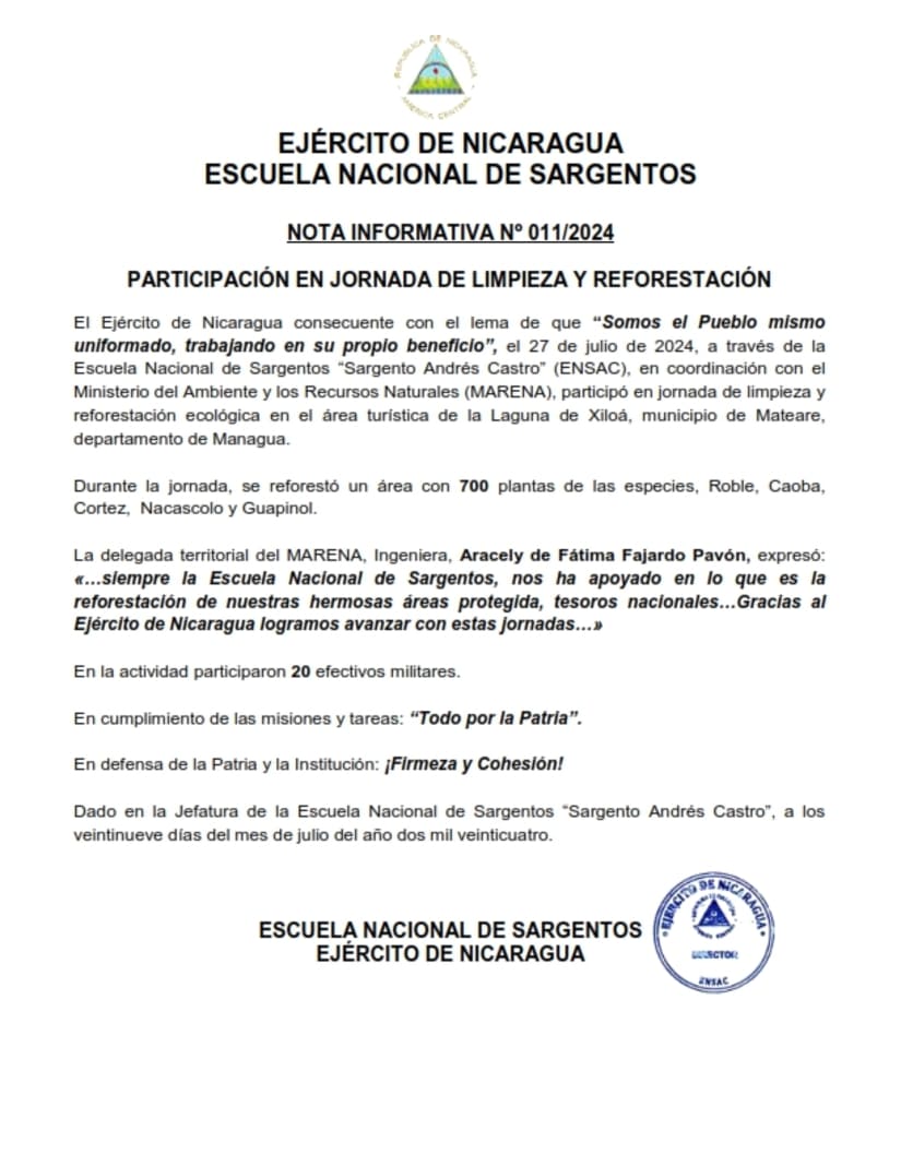 El Ejército de Nicaragua consecuente con el lema de que “Somos el Pueblo mismo uniformado, trabajando en su propio beneficio”, el 27 de julio de 2024, a través de la Escuela Nacional de Sargentos “Sargento Andrés Castro” (ENSAC), en coordinación con el Ministerio del Ambiente y los Recursos Naturales (MARENA), participó en jornada de limpieza y reforestación ecológica en el área turística de la Laguna de Xiloá, municipio de Mateare, departamento de Managua.