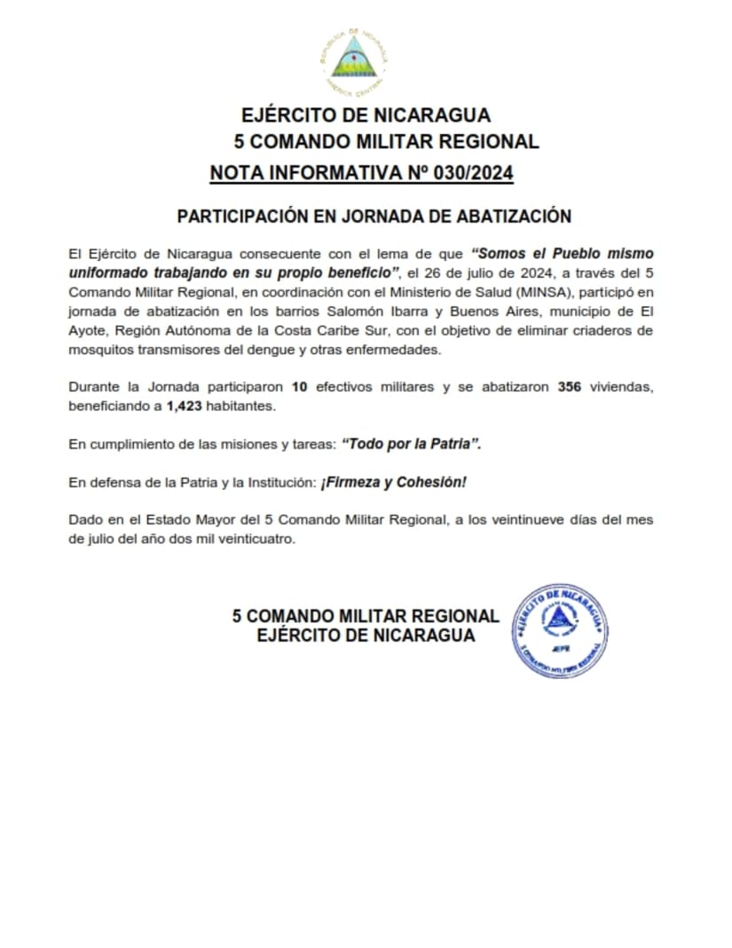El Ejército de Nicaragua consecuente con el lema de que “Somos el Pueblo mismo uniformado trabajando en su propio beneficio”, el 26 de julio de 2024, a través del 5 Comando Militar Regional, en coordinación con el Ministerio de Salud (MINSA), participó en jornada de abatización en los barrios Salomón Ibarra y Buenos Aires, municipio de El Ayote, Región Autónoma de la Costa Caribe Sur, con el objetivo de eliminar criaderos de mosquitos transmisores del dengue y otras enfermedades.