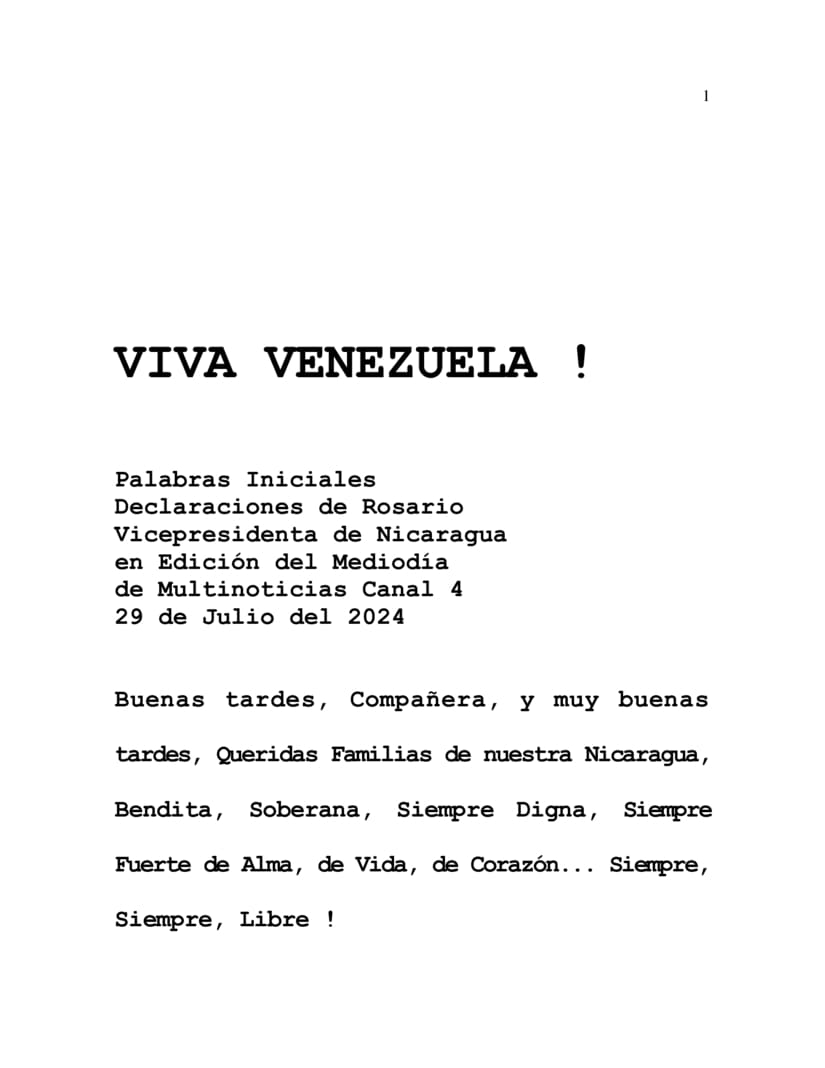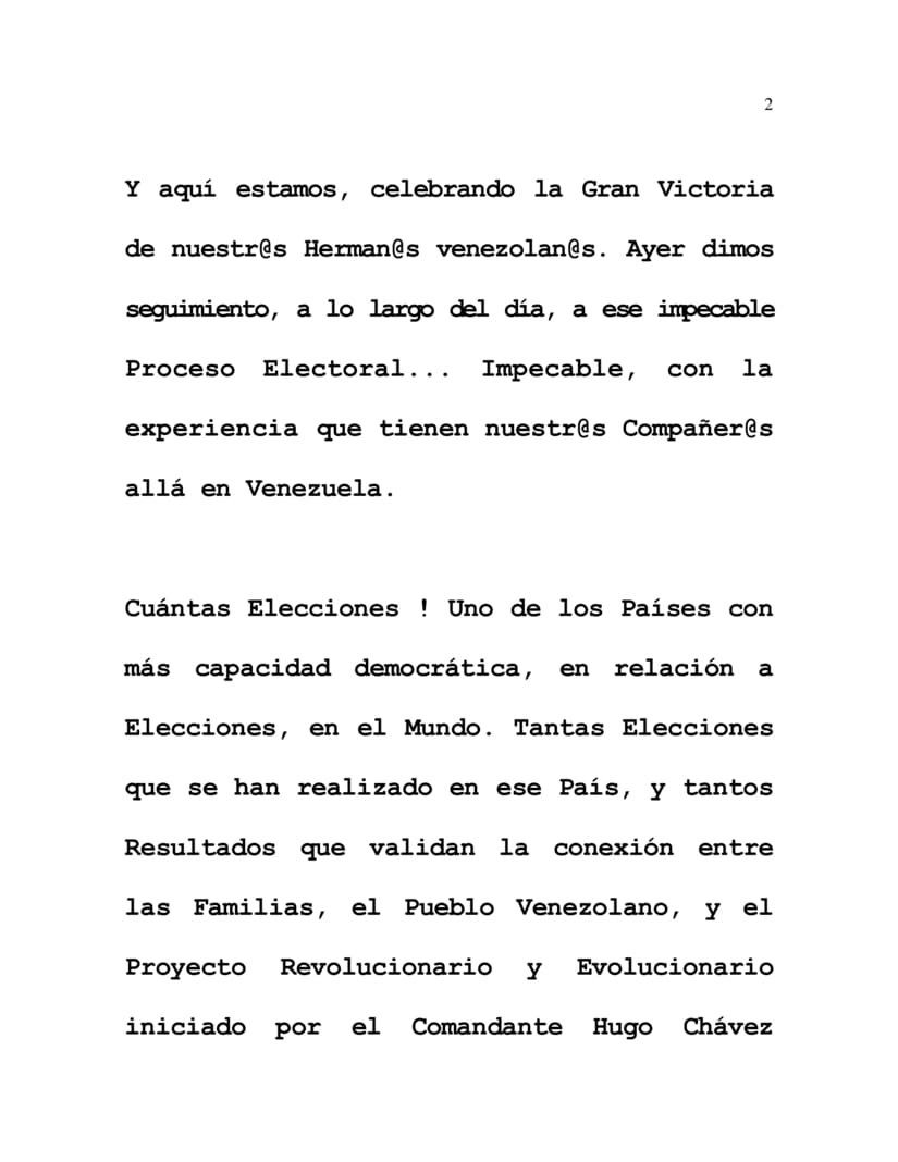 Good afternoon, Compañera, and a very good afternoon, Beloved Families of our Nicaragua, Blessed, Sovereign, Always Full of Dignity, Always Strong of Soul, of Life, of Heart... And Always, Forever Free! And here we are, celebrating the Great Victory of our Venezuelan Brothers and Sisters. Yesterday, throughout the day we were following their impeccable Electoral Process... Impeccable, given all the experience our Compañeras and Compañeros have there in Venezuela.