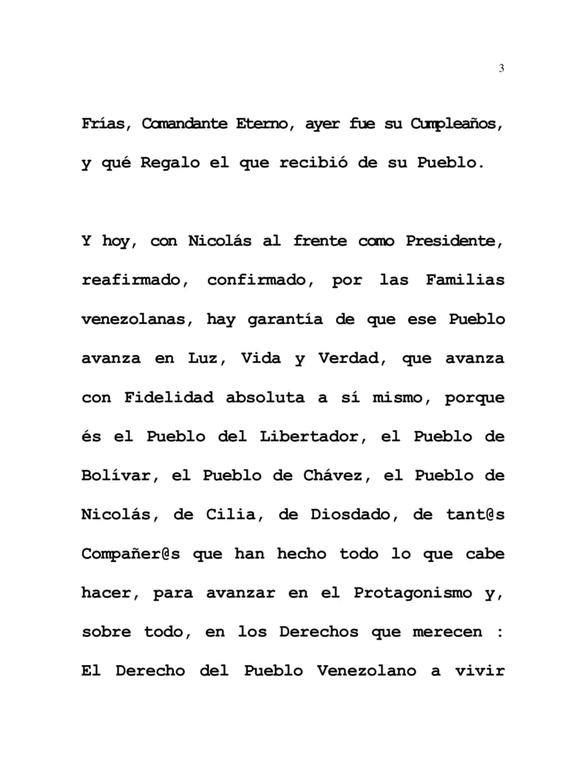 Now today, with Nicolás reaffirmed at the helm as President, confirmed by Venezuela's Families, that is the guarantee that this People is advancing in Light, Life and Truth, advancing in absolute Fidelity to itself, because they are the People of the Liberator, the People of Bolívar, the People of Chávez, the People of Nicolás, of Cilia, of Diosdado, of so many Comrades who have done everything that possibly can be done for the People to advance as Protagonists and, above all, with all the Rights that they deserve: The Right of Venezuela's People to live in Peace, and the Right of the Venezuela's People to use their own resources, their abundant natural resources, to work and prosper.