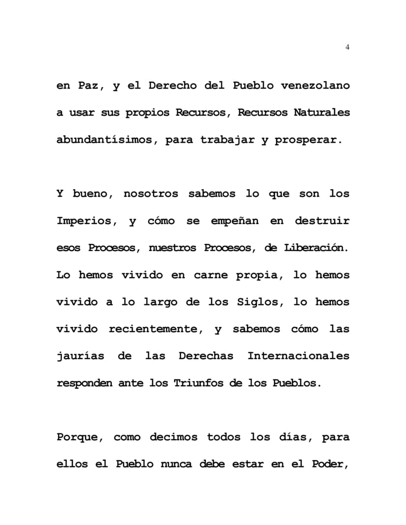 Y bueno, nosotros sabemos lo que son los Imperios, y cómo se empeñan en destruir esos Procesos, nuestros Procesos, de Liberación. Lo hemos vivido en carne propia, lo hemos vivido a lo largo de los Siglos, lo hemos vivido recientemente, y sabemos cómo las jaurías de las Derechas Internacionales responden ante los Triunfos de los Pueblos.