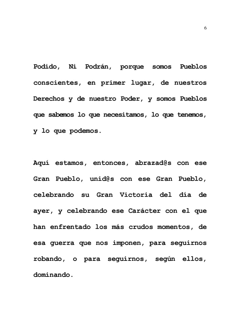 Here we are, then, embraced with that Great People, united with that Great People, celebrating their Great Victory of yesterday, and celebrating the Character with which they have faced the harshest moments of the war they impose on us, seeking to continue stealing from us, or to continue dominating us, by their lights.