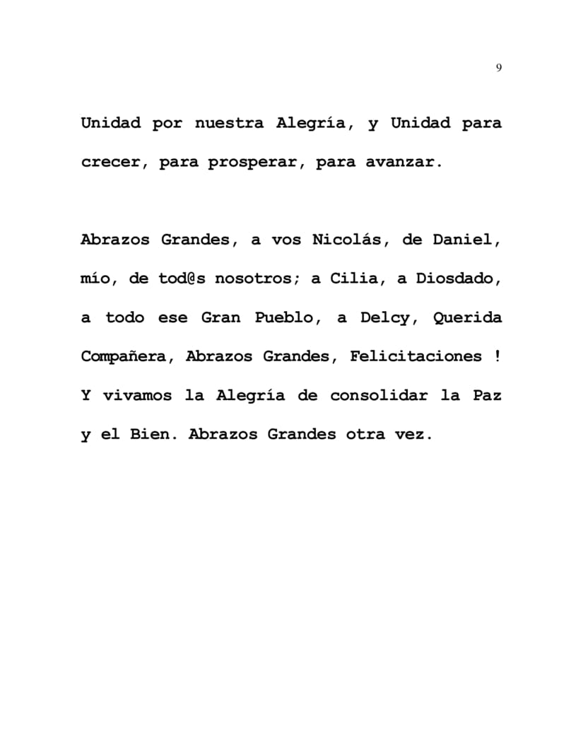 Warm Embraces to you Nicolás, from Daniel, from me, from all of us; to Cilia, to Diosdado, to all your Great People, to Delcy, beloved compañera, Warm Embraces, Congratulations! And let us live the Joy of consolidating Peace and Goodness. Again, Warm Embraces.