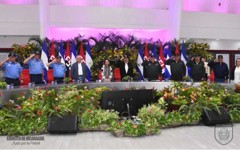 El Ejército de Nicaragua consecuente con el lema de que “Somos el Pueblo mismo uniformado trabajando en su propio beneficio”, el 30 de julio de 2024, en el Centro de Convenciones “Olof Palme”, realizó acto de conmemoración del 45 Aniversario de Fundación de la Fuerza Aérea del Ejército de Nicaragua, presidido por el Presidente de la República y Jefe Supremo del Ejército de Nicaragua, Comandante Daniel Ortega Saavedra; la Vicepresidenta de la República, Compañera Rosario Murillo Zambrana; el Comandante en Jefe del Ejército de Nicaragua, General de Ejército Julio César Avilés Castillo; el Presidente de la Asamblea Nacional, doctor Gustavo Porras Cortés; el Jefe del Estado Mayor General, Mayor General Bayardo Ramón Rodríguez Ruiz; el Inspector General, Mayor General Marvin Elías Corrales Rodríguez; el jefe de la Fuerza Aérea, General de Brigada Efrén Alejandro Marín Serrano; la Ministra de Defensa, licenciada Rosa Adelina Barahona Castro, el Director General de la Policía Nacional, Primer Comisionado Francisco Javier Díaz Madriz; el Ministro Asesor del Presidente de la República para Asuntos de Seguridad, Comisionado General Horacio Rocha López y el Subdirector General de la Policía Nacional, Comisionado General Zhukov Serrano Pérez.