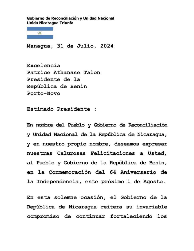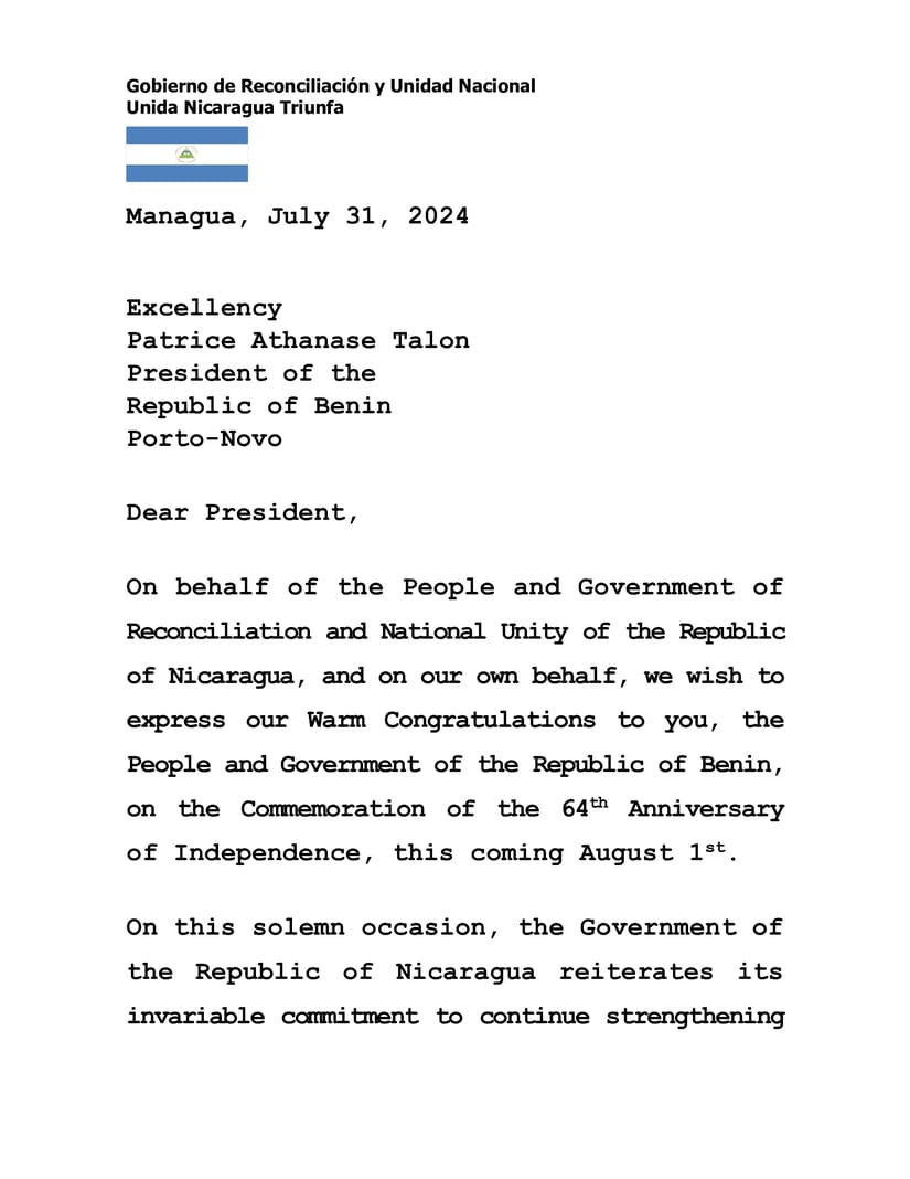 En nombre del Pueblo y Gobierno de Reconciliación y Unidad Nacional de la República de Nicaragua, y en nuestro propio nombre, deseamos expresar nuestras Calurosas Felicitaciones a Usted, al Pueblo y Gobierno de la República de Benín, en la Conmemoración del 64 Aniversario de la Independencia, este próximo 1 de Agosto.