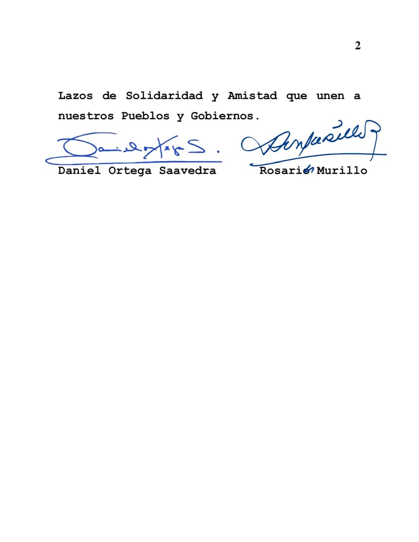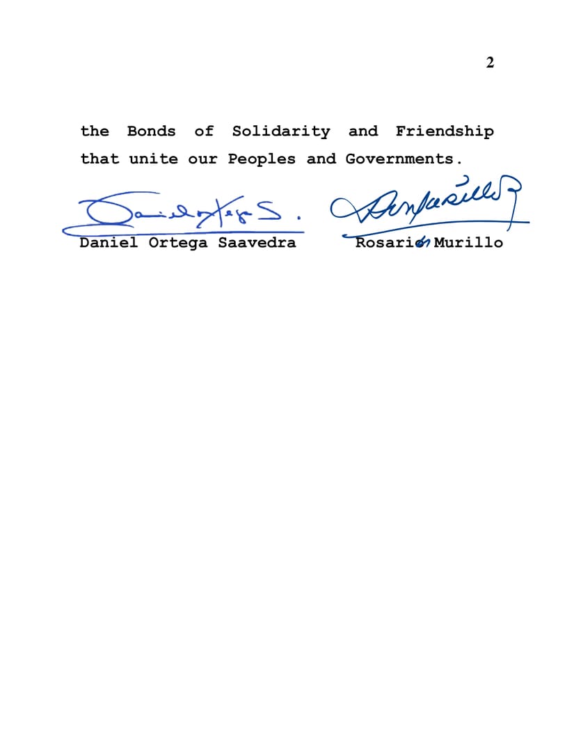 On this solemn occasion, the Government of the Republic of Nicaragua reiterates its invariable commitment to continue strengthening the Bonds of Solidarity and Friendship that unite our Peoples and Governments.