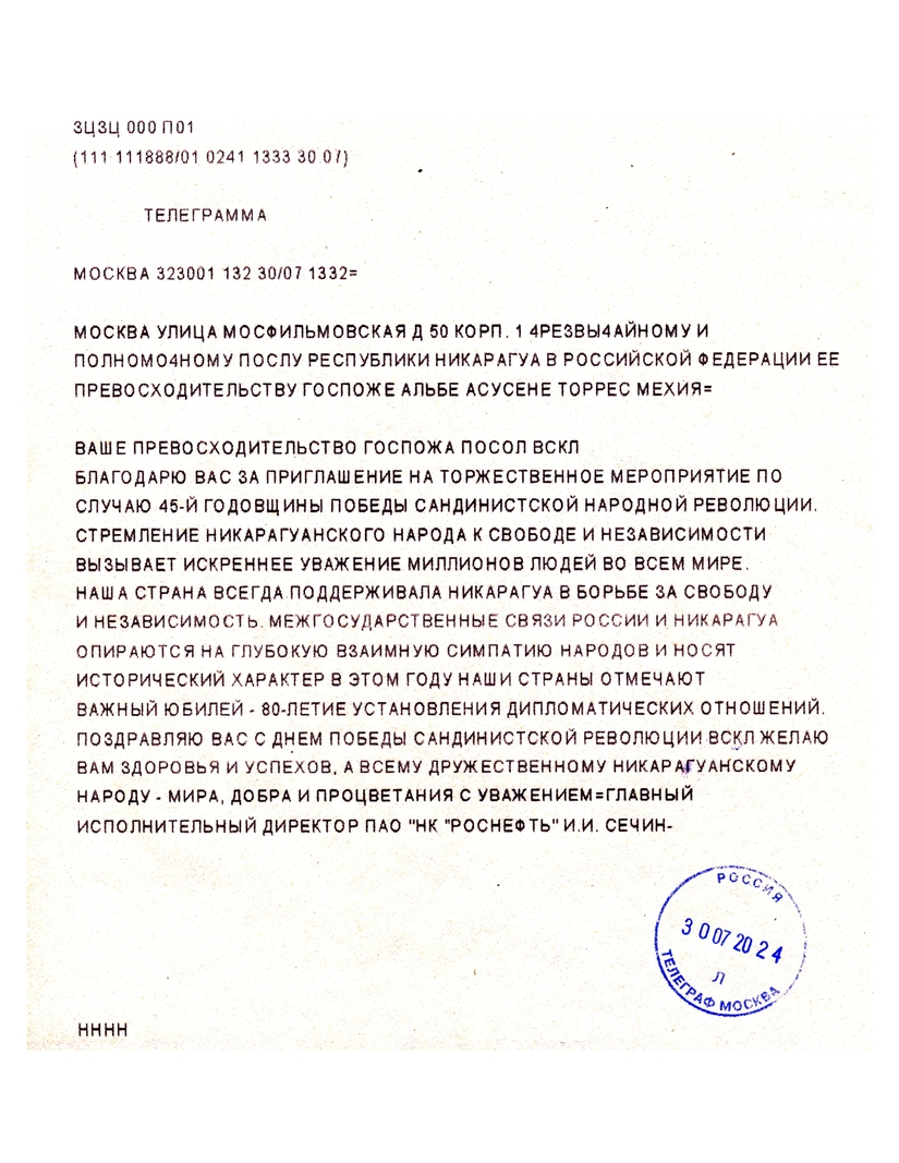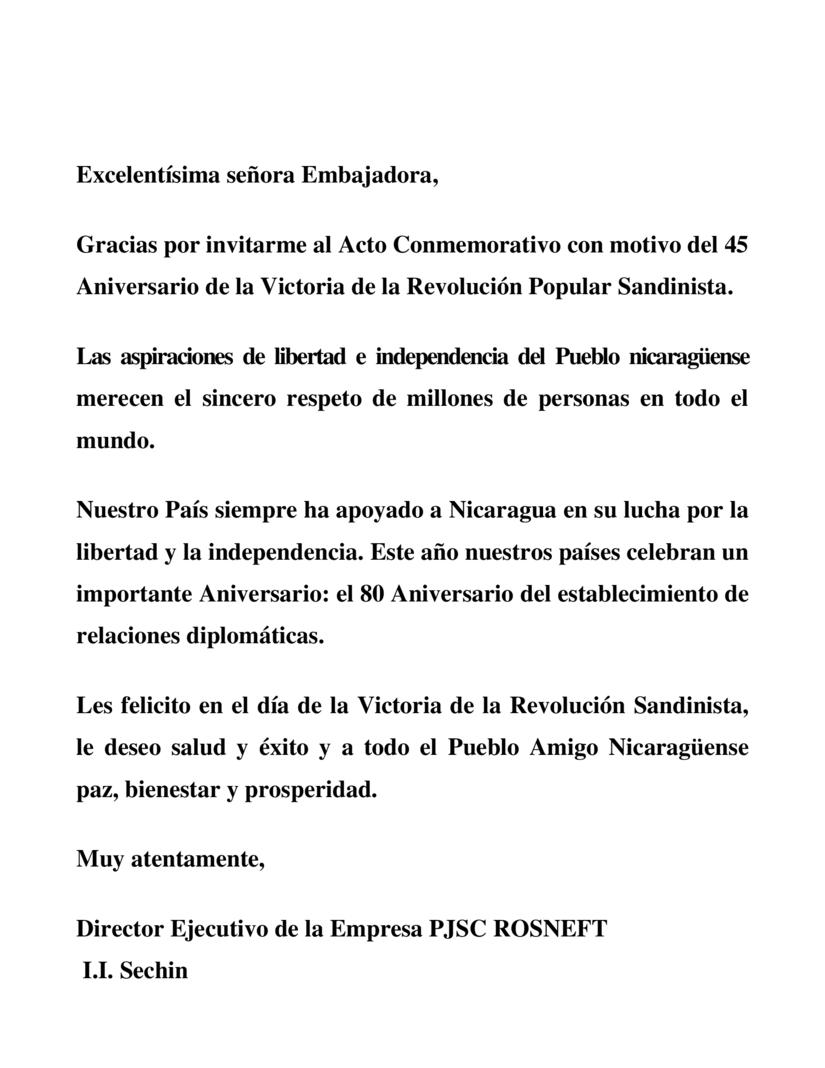Mensaje de Felicitaciones del Compañero Igor Sechin, Director Ejecutivo de la Empresa PJSC ROSNEFT, a nuestra Embajada en la Federación de Rusia, con motivo del 45 Aniversario de la Revolución Popular Sandinista.