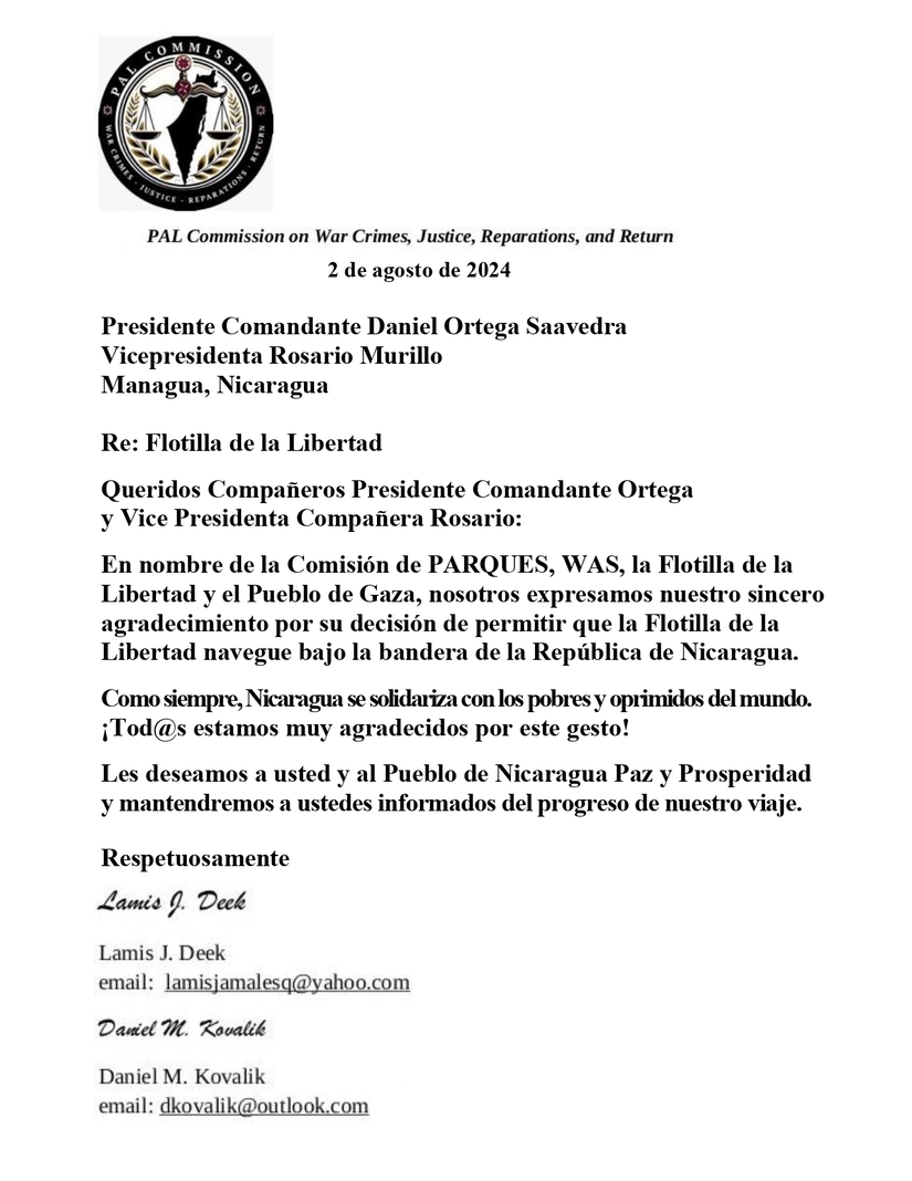 Carta suscrita por los Hermanos Lamis J. Deek y Daniel M. Kovalik, agradeciendo a nuestro Pueblo y Gobierno, por permitir que la Flotilla de la Libertad navega bajo la bandera de la República de Nicaragua.