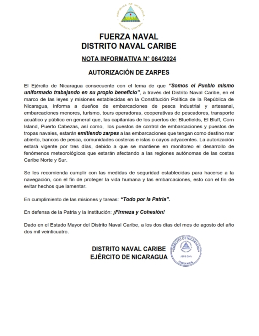 El Ejército de Nicaragua consecuente con el lema de que “Somos el Pueblo mismo uniformado trabajando en su propio beneficio”, a través del Distrito Naval Caribe, en el marco de las leyes y misiones establecidas en la Constitución Política de la República de Nicaragua, informa a dueños de embarcaciones de pesca industrial y artesanal, embarcaciones menores, turismo, tours operadoras, cooperativas de pescadores, transporte acuático y público en general que, las capitanías de los puertos de: Bluefields, El Bluff, Corn Island, Puerto Cabezas, así como, los puestos de control de embarcaciones y puestos de tropas navales, estarán emitiendo zarpes a las embarcaciones que tengan como destino mar abierto, bancos de pesca, comunidades costeras e islas o cayos adyacentes. La autorización estará vigente por tres días, debido a que se mantiene en monitoreo el desarrollo de fenómenos meteorológicos que estarán afectando a las regiones autónomas de las costas Caribe Norte y Sur.