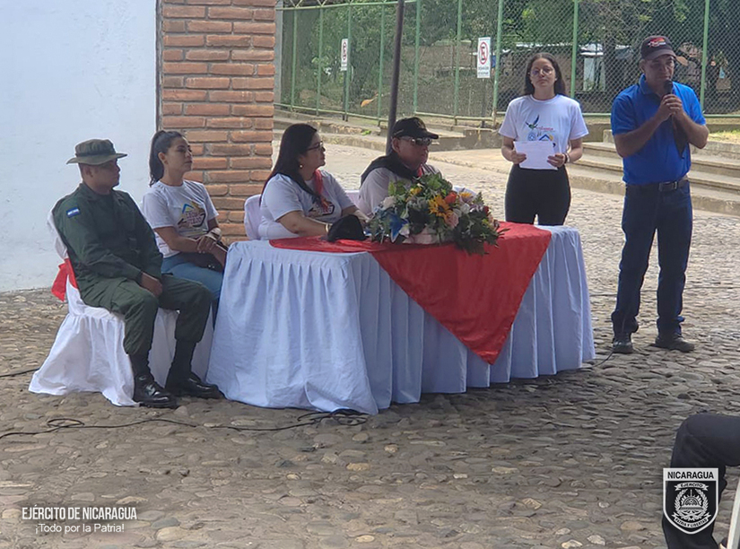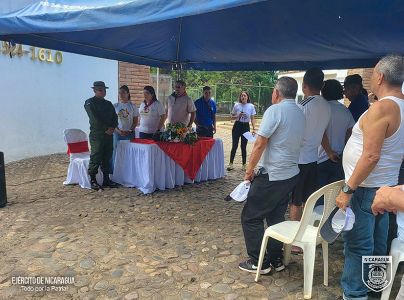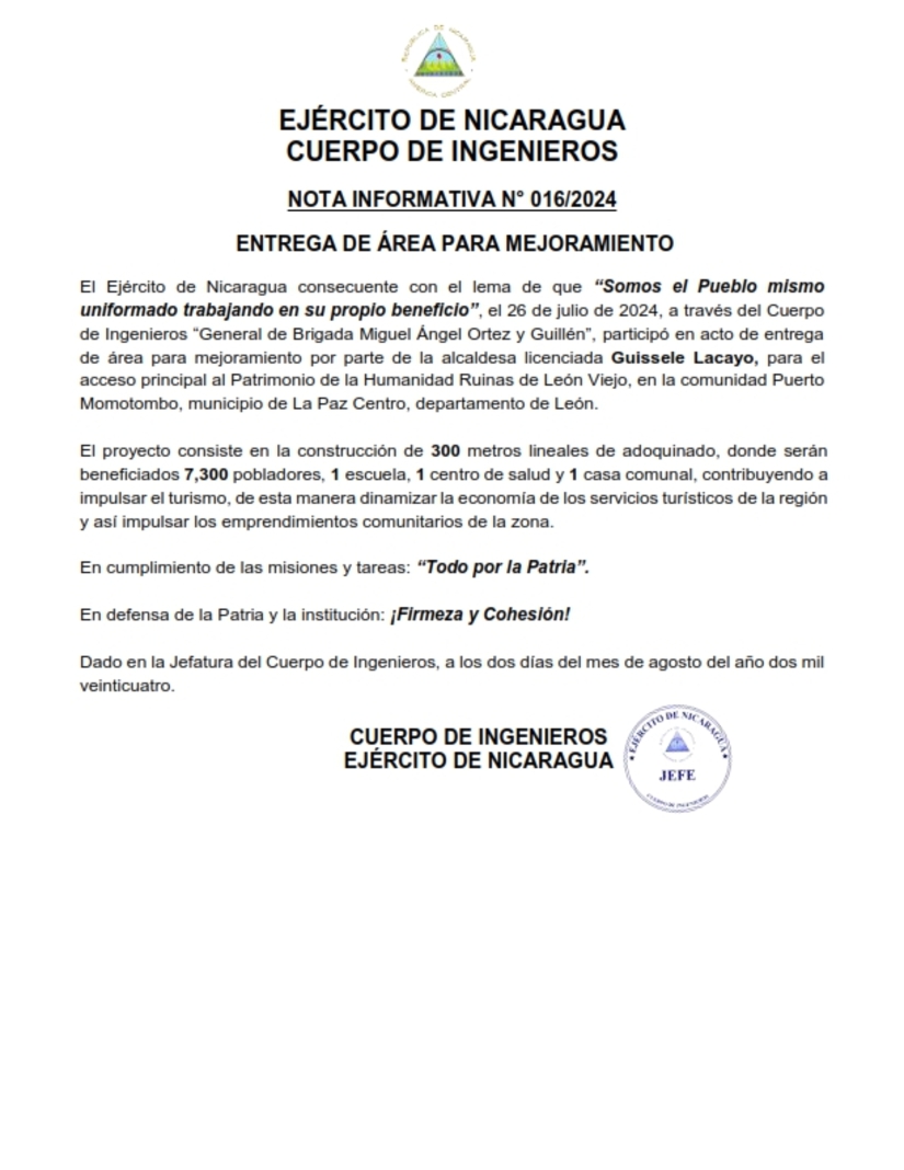 El Ejército de Nicaragua consecuente con el lema de que “Somos el Pueblo mismo uniformado trabajando en su propio beneficio”, el 26 de julio de 2024, a través del Cuerpo de Ingenieros “General de Brigada Miguel Ángel Ortez y Guillén”, participó en acto de entrega de área para mejoramiento por parte de la alcaldesa licenciada Guissele Lacayo, para el acceso principal al Patrimonio de la Humanidad Ruinas de León Viejo, en la comunidad Puerto Momotombo, municipio de La Paz Centro, departamento de León.