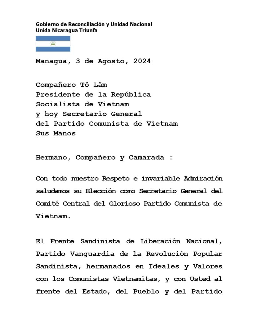El Frente Sandinista de Liberación Nacional, Partido Vanguardia de la Revolución Popular Sandinista, hermanados en Ideales y Valores con los Comunistas Vietnamitas, y con Usted al frente del Estado, del Pueblo y del Partido de ese Glorioso País, le saludamos y reiteramos nuestra disposición plena de fortalecer todos nuestros vínculos históricos, y actuales, para ir adelante en la construcción de un Mundo de Bien, de Paz y Unión Fraternal, creando en Caminos compartidos la Comunidad Humana de Cooperación Respetuosa y Solidaria que tod@s merecemos.