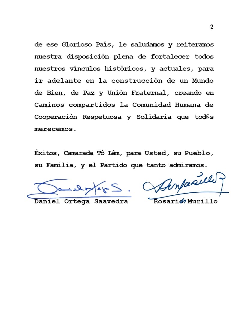 Mensaje de Saludos y Felicitaciones del Presidente Comandante Daniel Ortega y la Vicepresidenta Compañera Rosario Murillo, al Hermano, Compañero y Camarada Tô Lâm, Presidente de la República Socialista de Vietnam, por su Elección como Secretario General del Comité Central del Glorioso Partido Comunista de Vietnam.
