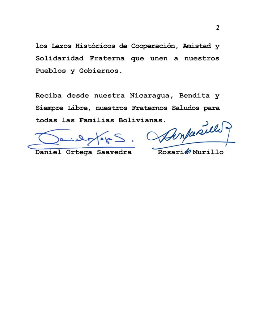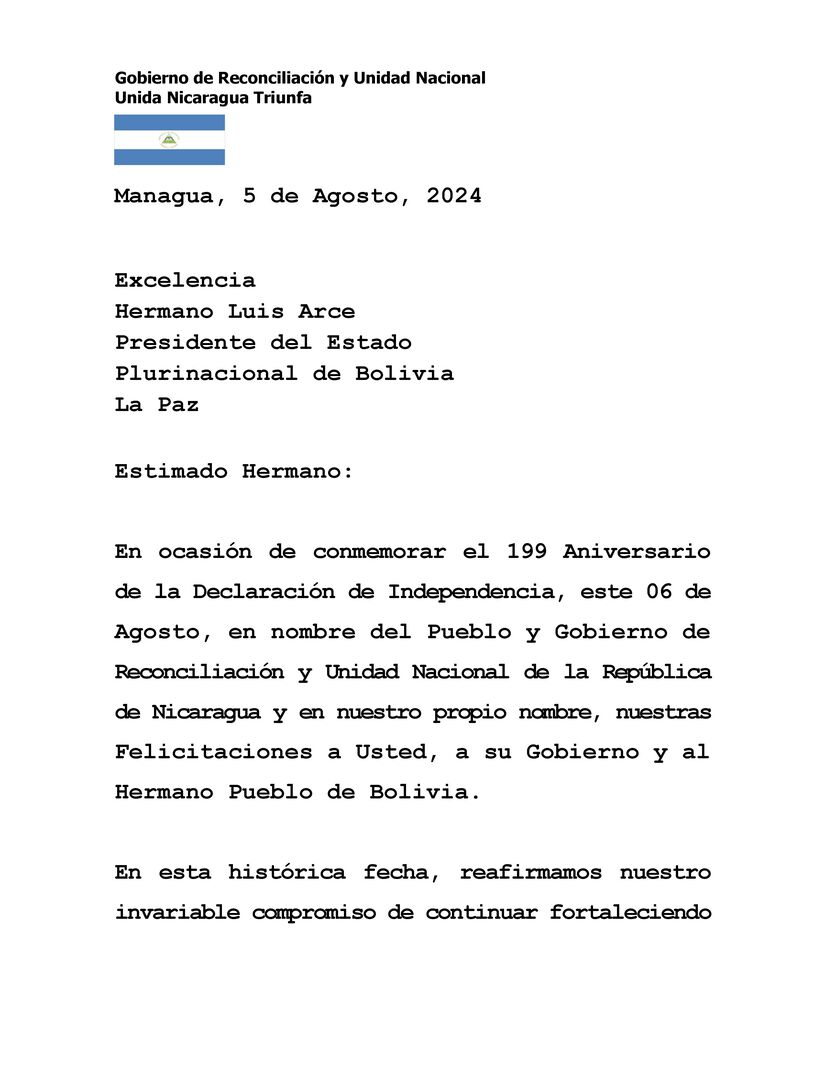 En ocasión de conmemorar el 199 Aniversario de la Declaración de Independencia, este 06 de Agosto, en nombre del Pueblo y Gobierno de Reconciliación y Unidad Nacional de la República de Nicaragua y en nuestro propio nombre, nuestras Felicitaciones a Usted, a su Gobierno y al Hermano Pueblo de Bolivia.