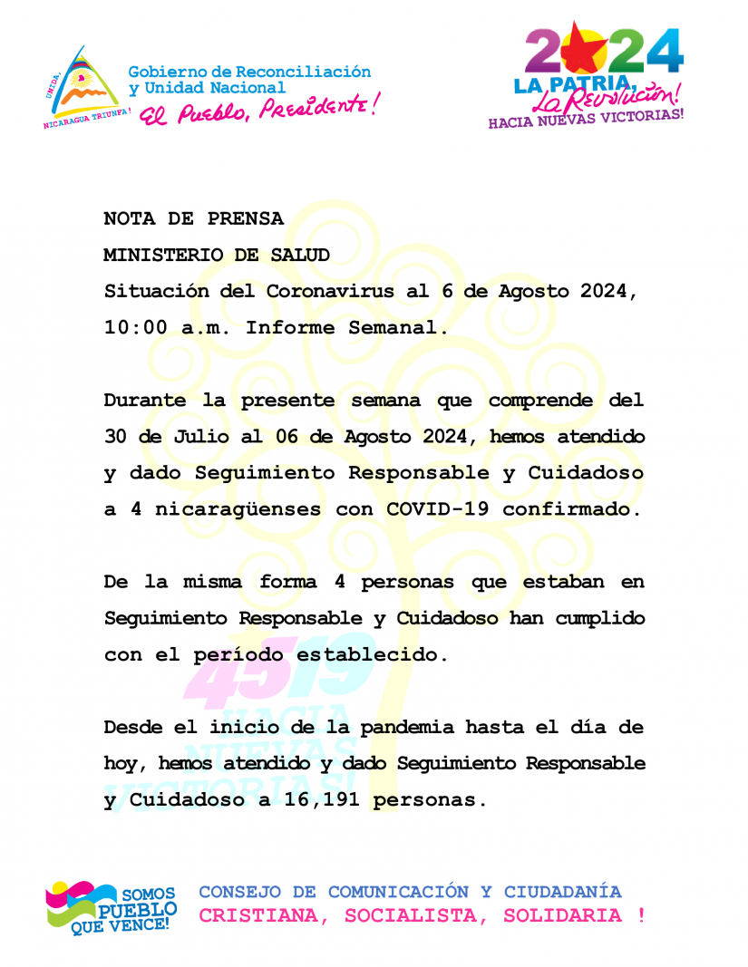 During the current week, from 30th July to 6th August 2024, we have attended and provided Responsible and Careful Care to 4 Nicaraguans confirmed to be COVID-19 positive.