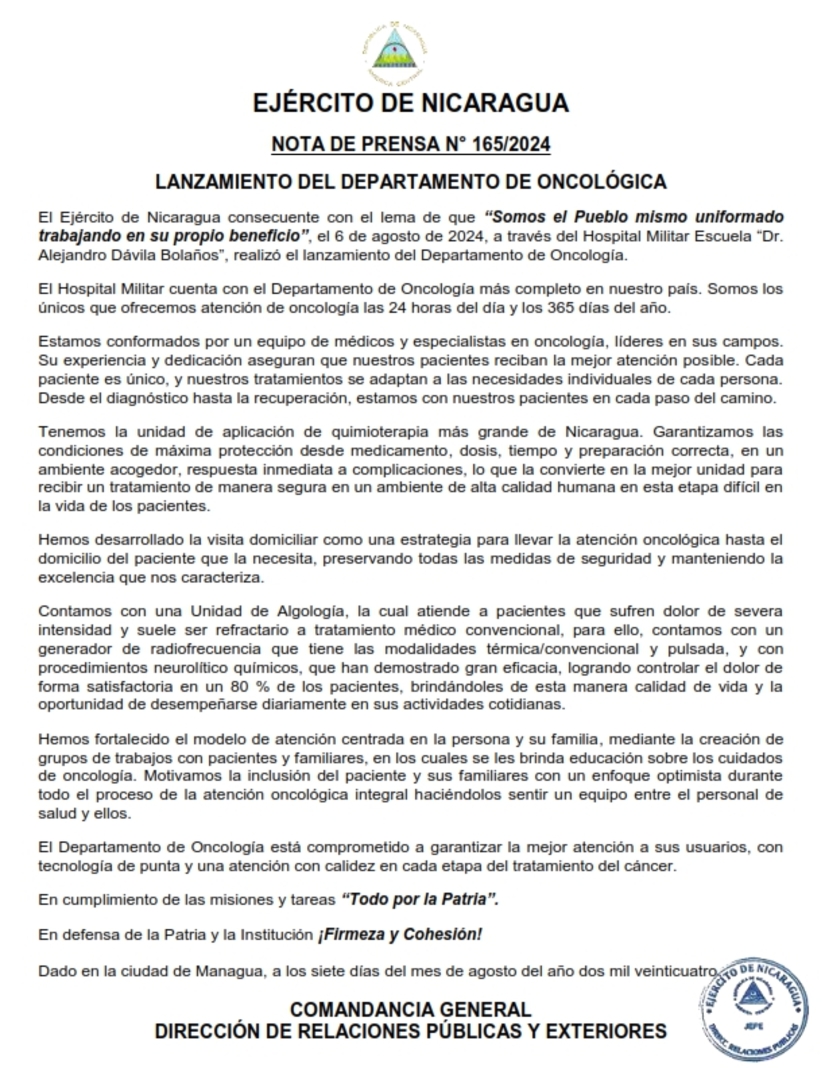 El Ejército de Nicaragua consecuente con el lema de que “Somos el Pueblo mismo uniformado trabajando en su propio beneficio”, el 6 de agosto de 2024, a través del Hospital Militar Escuela “Dr. Alejandro Dávila Bolaños”, realizó el lanzamiento del Departamento de Oncología.
