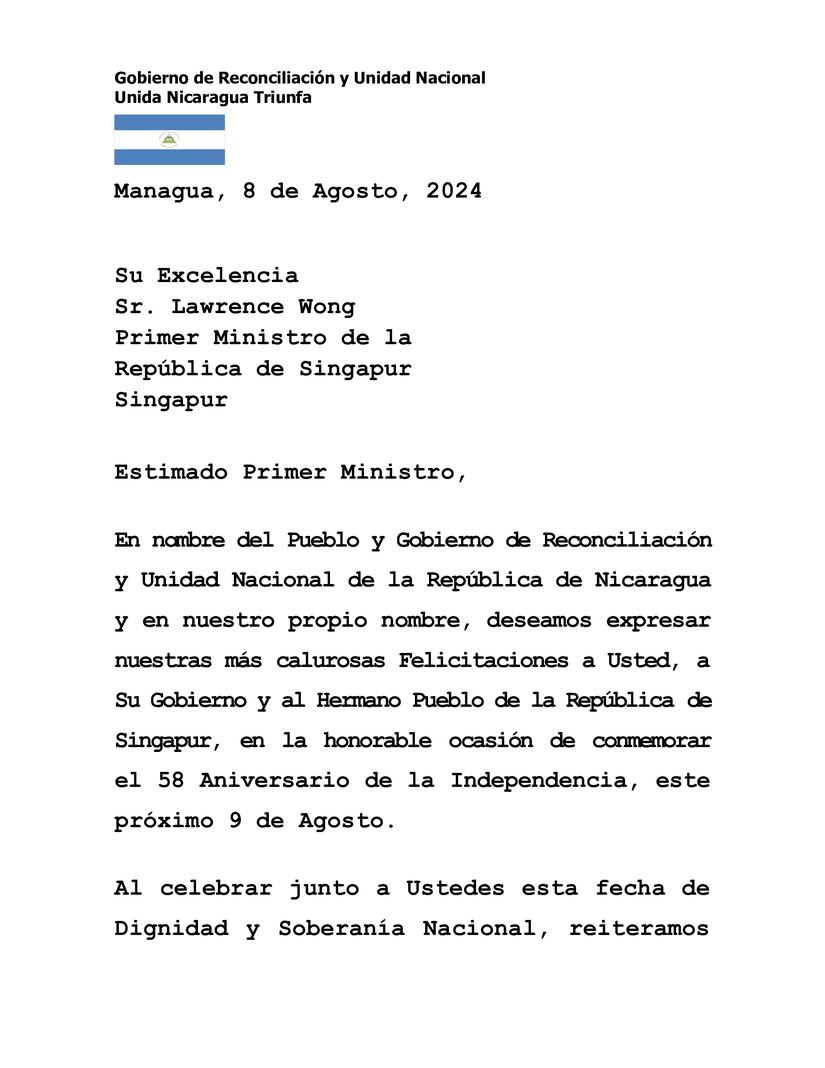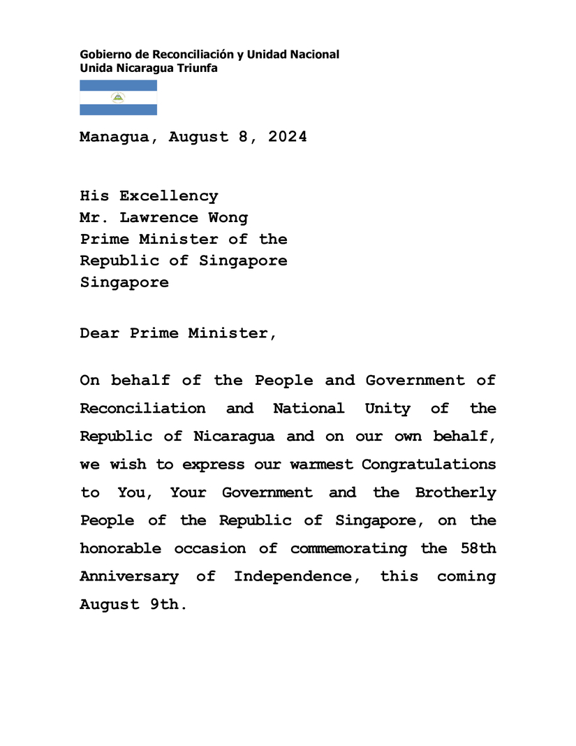 En nombre del Pueblo y Gobierno de Reconciliación y Unidad Nacional de la República de Nicaragua y en nuestro propio nombre, deseamos expresar nuestras más calurosas Felicitaciones a Usted, a Su Gobierno y al Hermano Pueblo de la República de Singapur, en la honorable ocasión de conmemorar el 58 Aniversario de la Independencia, este próximo 9 de Agosto.