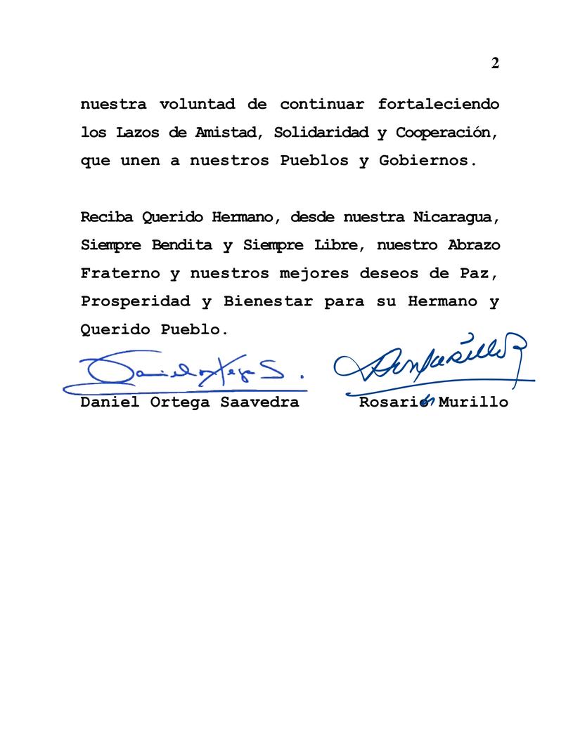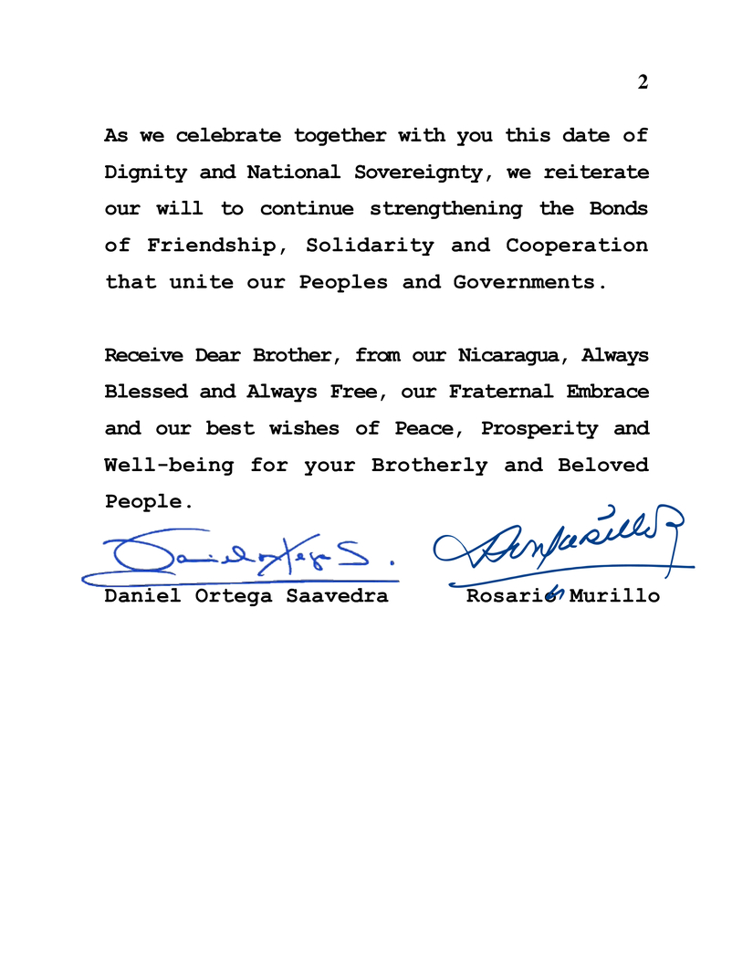 Reciba Querido Hermano, desde nuestra Nicaragua, Siempre Bendita y Siempre Libre, nuestro Abrazo Fraterno y nuestros mejores deseos de Paz, Prosperidad y Bienestar para su Hermano y Querido Pueblo.