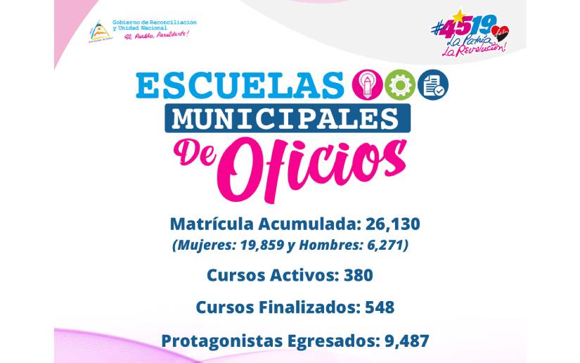 La Compañera Rosario Murillo, Vicepresidenta de Nicaragua dijo que se han inaugurado en este 2024, 12 Escuelas Municipales de Oficios de las 26 proyectadas este año.