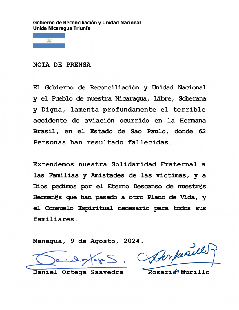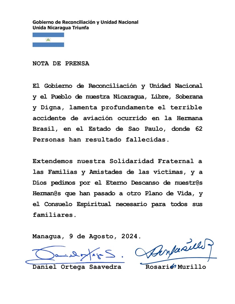 El Gobierno de Reconciliación y Unidad Nacional y el Pueblo de nuestra Nicaragua, Libre, Soberana y Digna, lamenta profundamente el terrible accidente de aviación ocurrido en la Hermana Brasil, en el Estado de Sao Paulo, donde 62 Personas han resultado fallecidas.